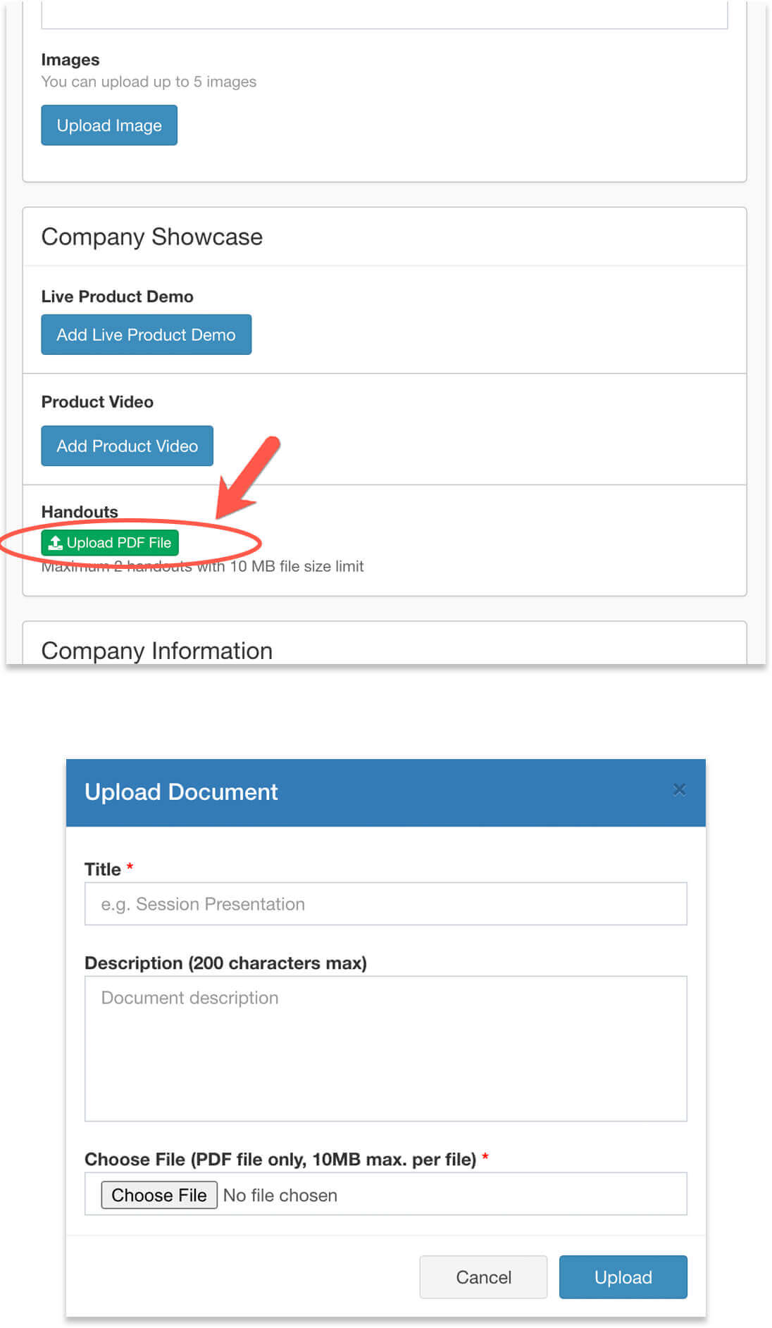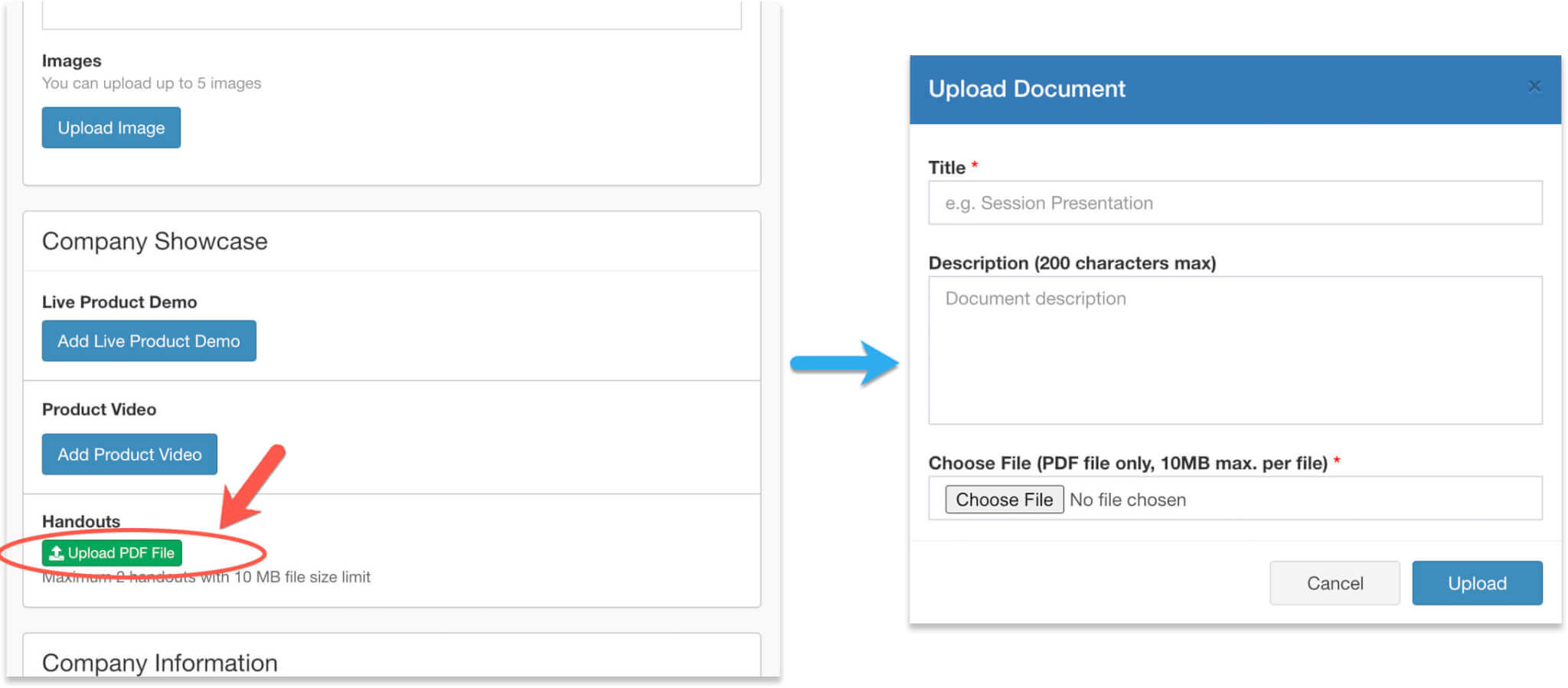 Upload handouts, videos, and setup live showcase