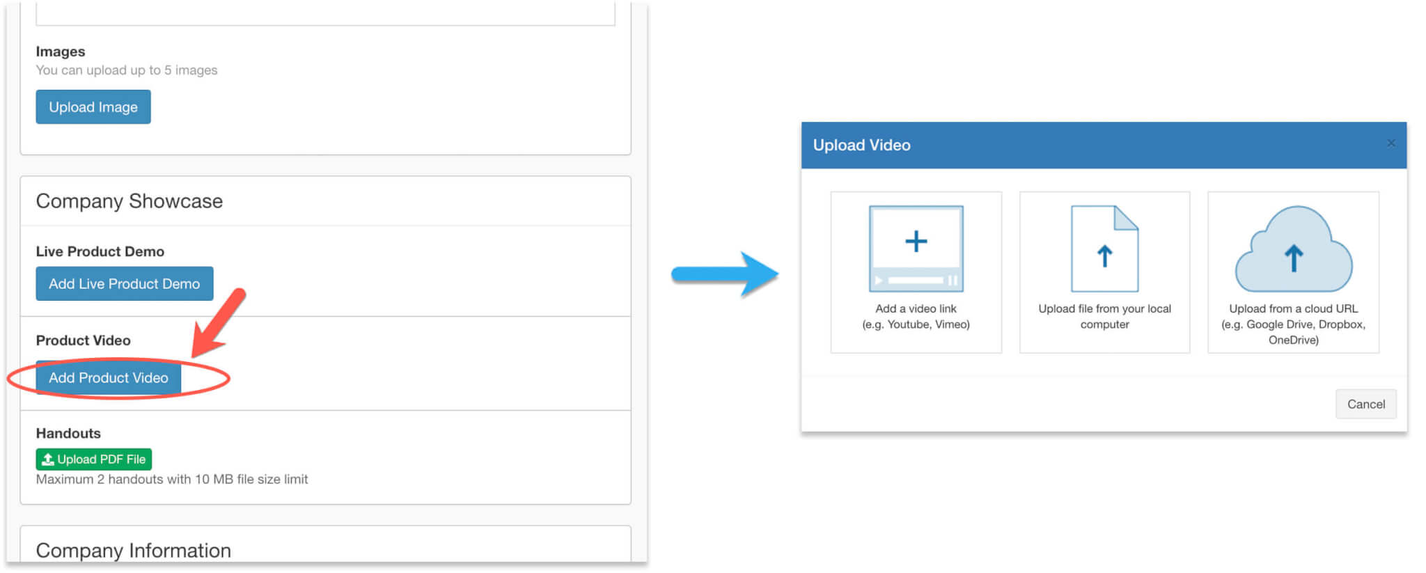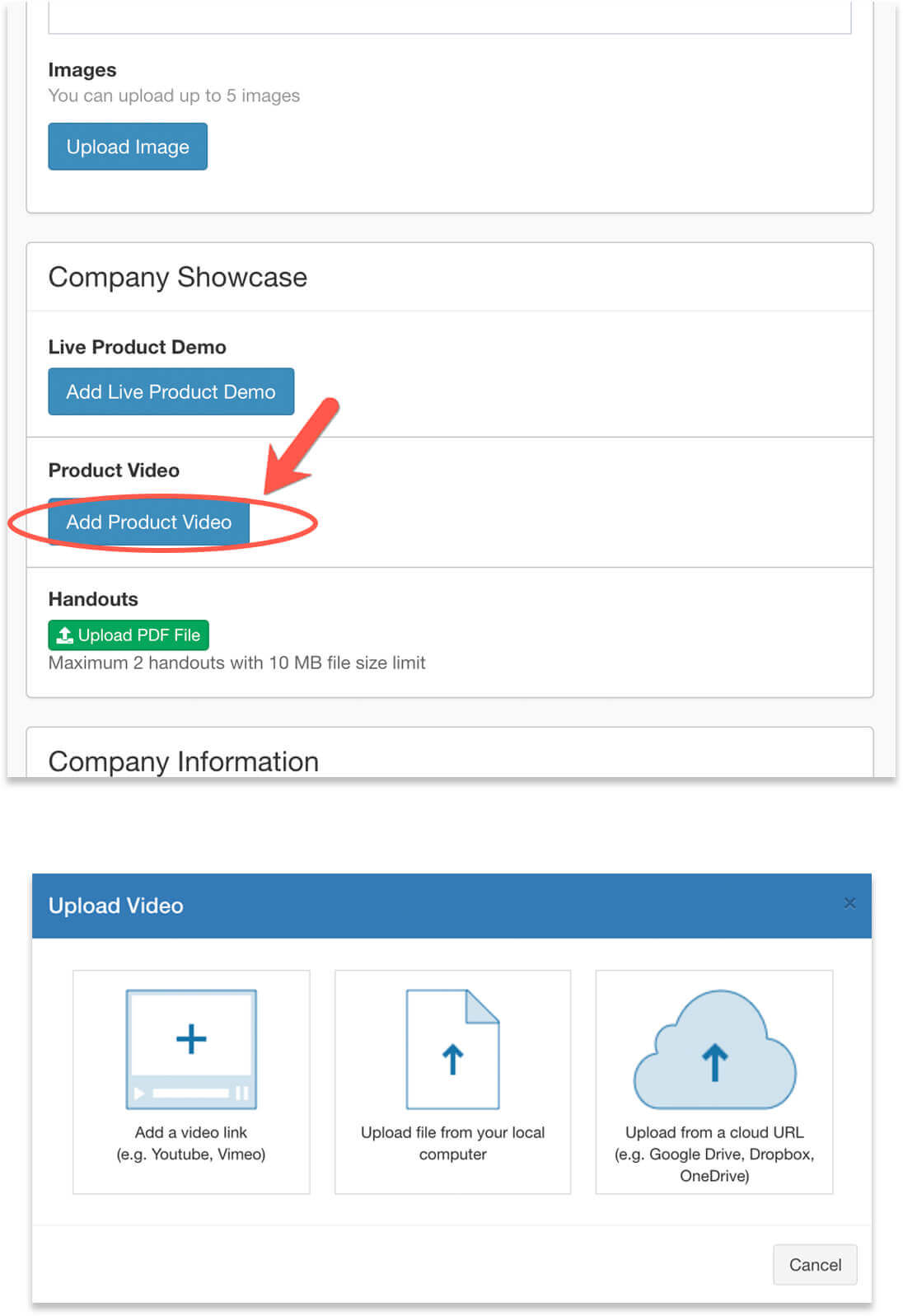 - Click “Add Product Video”, and select an option to upload your video, either by copying a link from 3rd party video storage, or upload a video file from your local computer. If you don’t see the option to upload a local file, please contact the event organizer to enable this option.