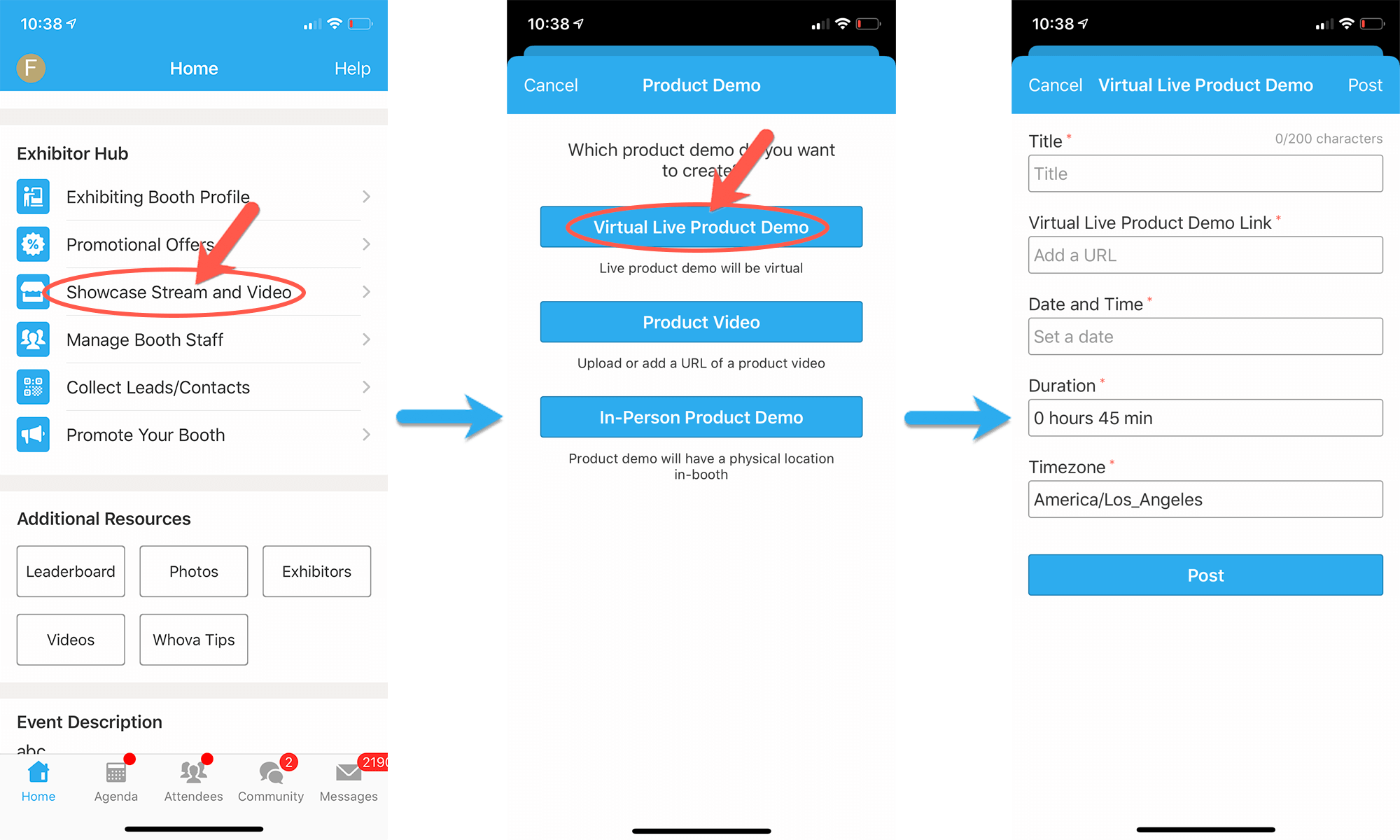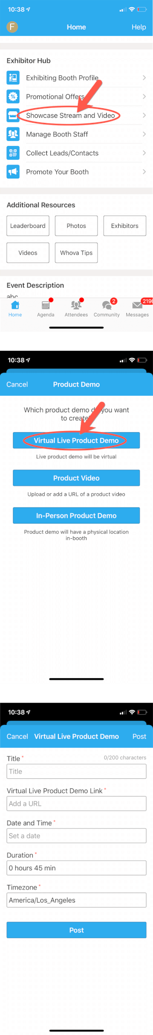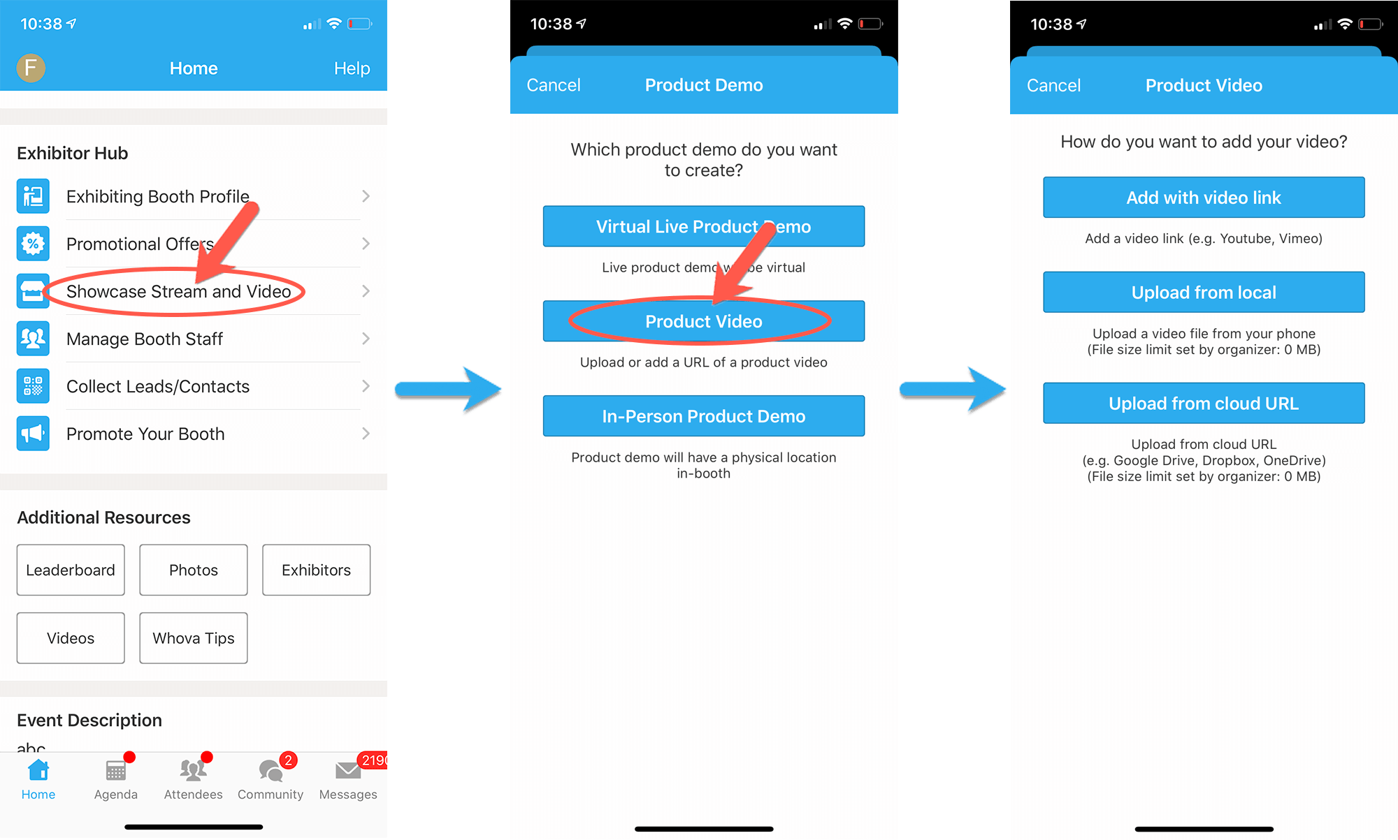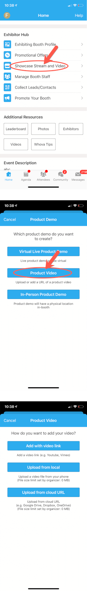 You can upload a product video or setup live showcase. Besides being displayed on your exhibitor profile, the videos and streams will also be compiled in a pinned Community Board topic.