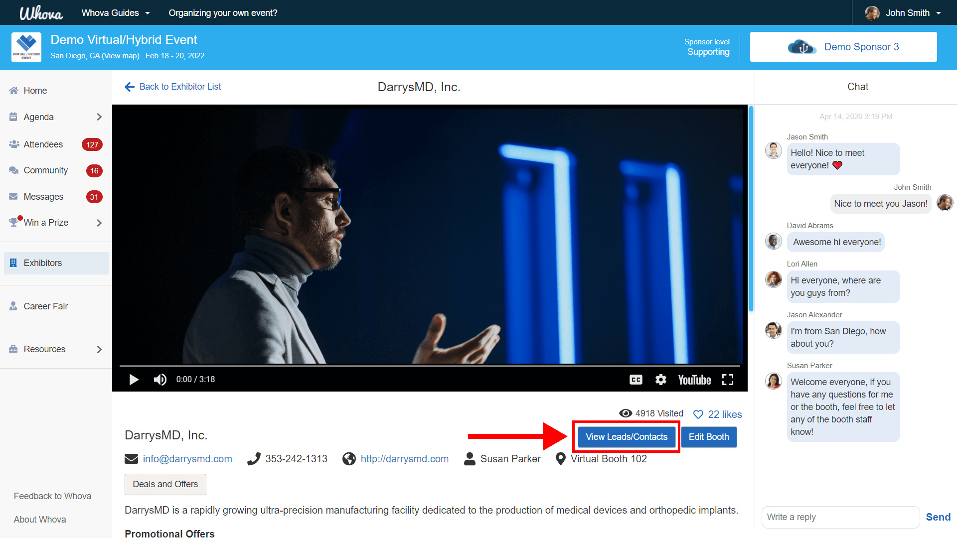 - Once you’ve entered your booth, find the View Leads/Contact button below visited and liked labels.