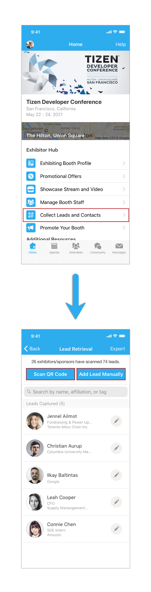 - Follow the previous steps to log in to the app, and find the Exhibitor Hub section. Click on Collect Leads. For now, you need to use the Whova mobile app to export the collected leads.