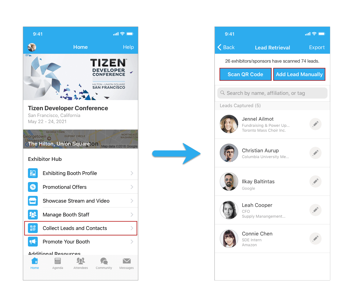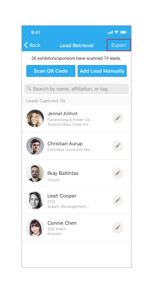 - From here, you can view all the leads collected at your booth and export the list
