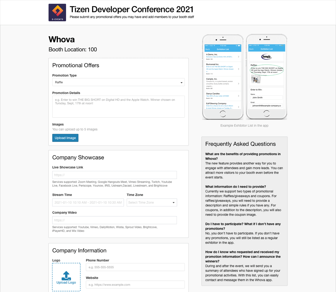 To successfully log in, please sign-in with the email you used when you registered the event as an exhibitor. - You will get multiple sections to fill out including, Promotional Offers, Company Showcase, Company Information, and Primary Contact.