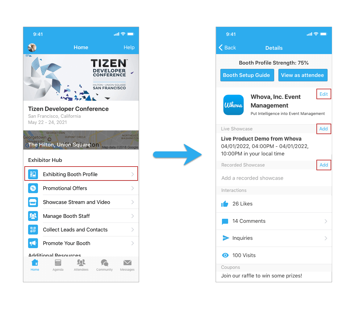 - There are two ways to access the exhibitor portal. This portal is where you will set up your exhibitor booth. The exhibitor portal is part of the “backend” of Whova products. Some features that are only available on the mobile app are not available here. For example, you cannot update your photos or company name, message attendees or scan leads.