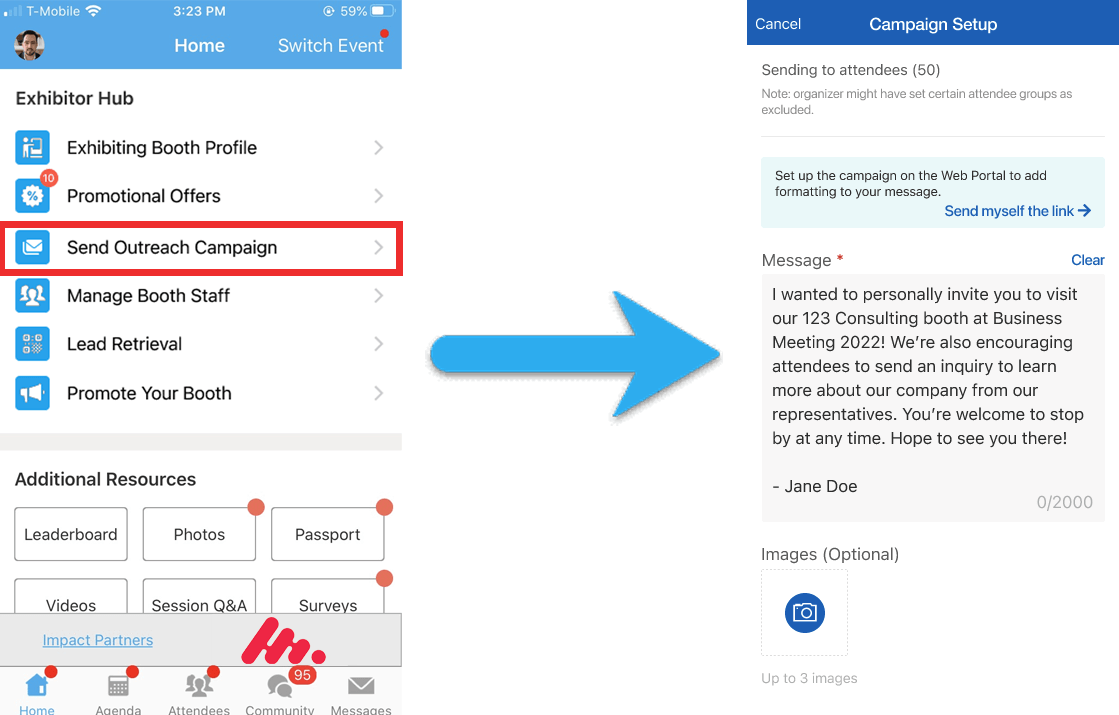 - On the event Home screen, scroll to the Exhibitor Hub section. Tap Send Outreach Campaign.