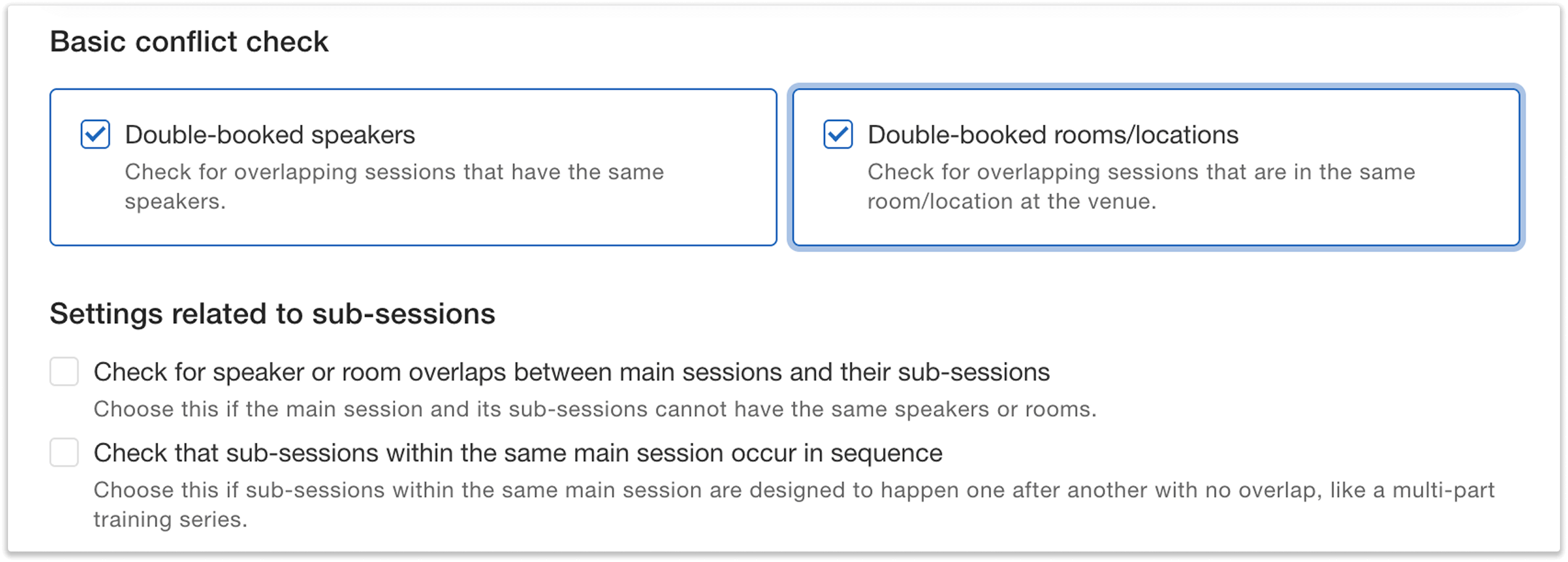 The Whova built-in Conflict Checker made it easy for DEKRA to identify scheduling issues — whether it was overlapping time slots, double-booked speakers, or unavailable meeting rooms. With a simple click of the “Check for Conflicts” button, they were able to instantly identify any scheduling issues, making it easy to resolve conflicts and streamline the planning process.
