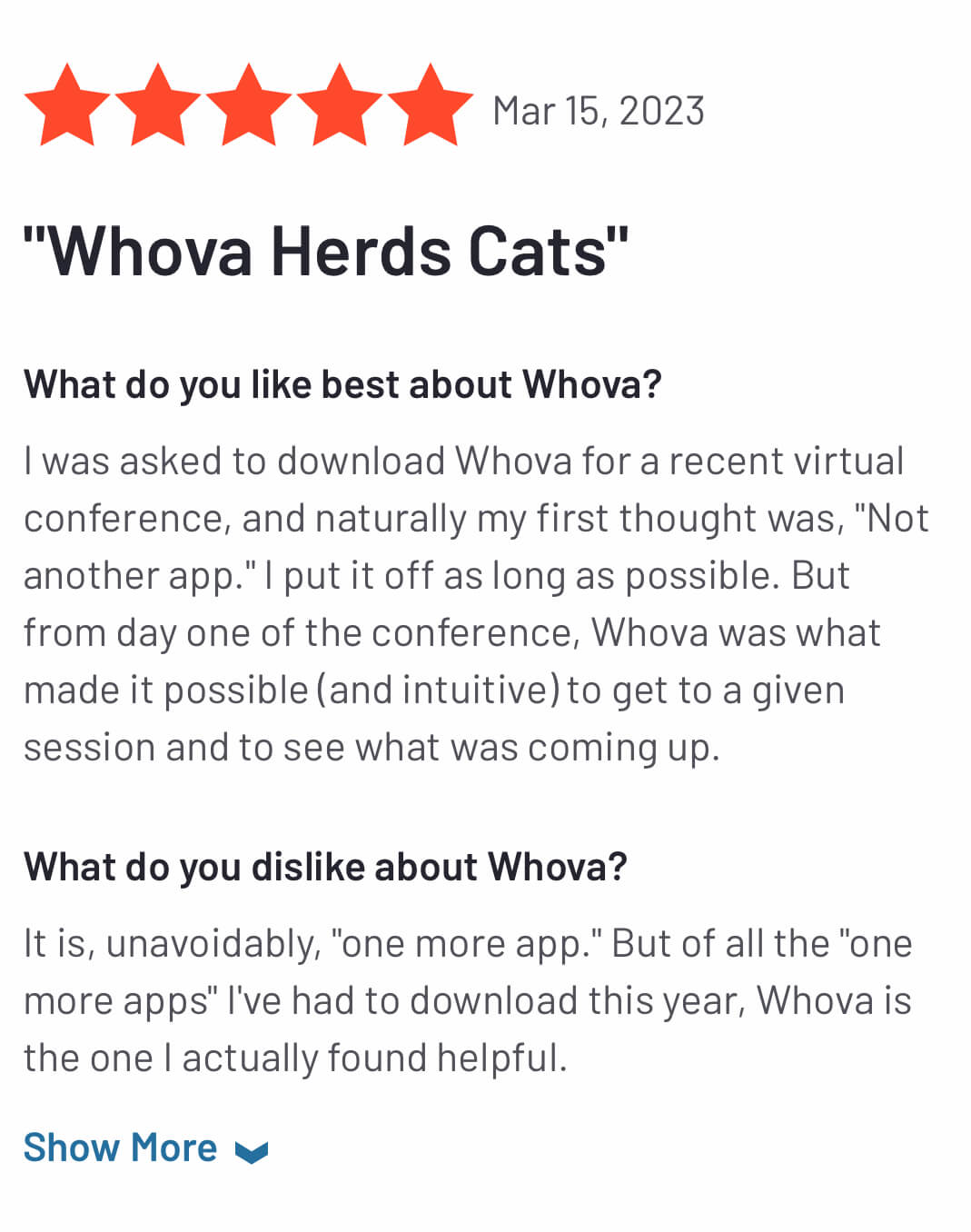 Had a 3 day virtual conference event where Whova was used. It worked out very nicely to interact with presenters and participants during this multi-day event. Not 100% like in-person, but avoid the drawbacks of travel. I would use it again.