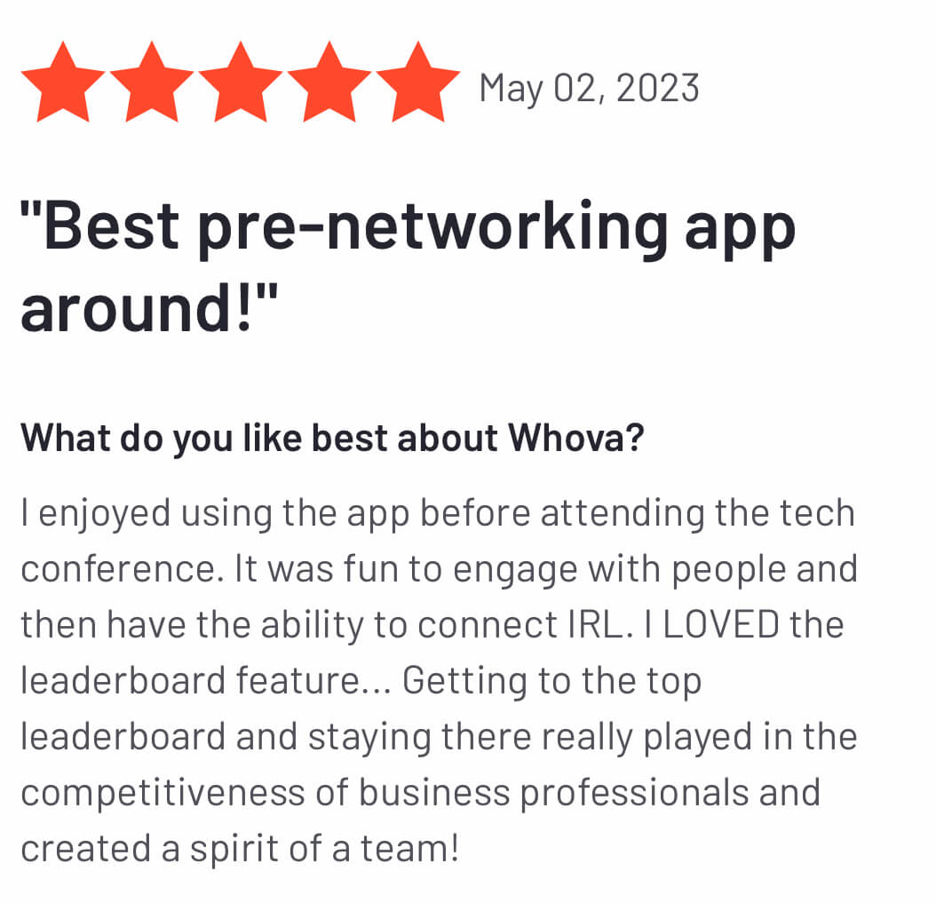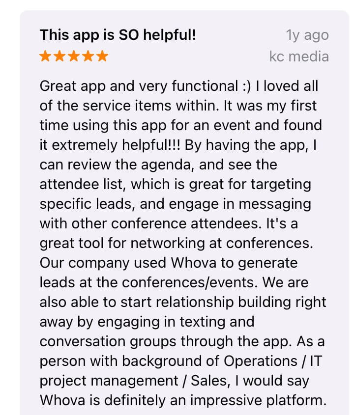 I’m letting you know that this is the best app ever. My delegation from UF used Whova for the ECAASU conference and it was amazing. We loved the features and found the chat messaging feature the best. We have a group of 30 people who will sing our love for the great and wonderful app of Whova.