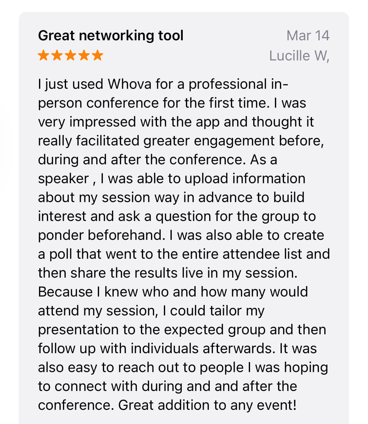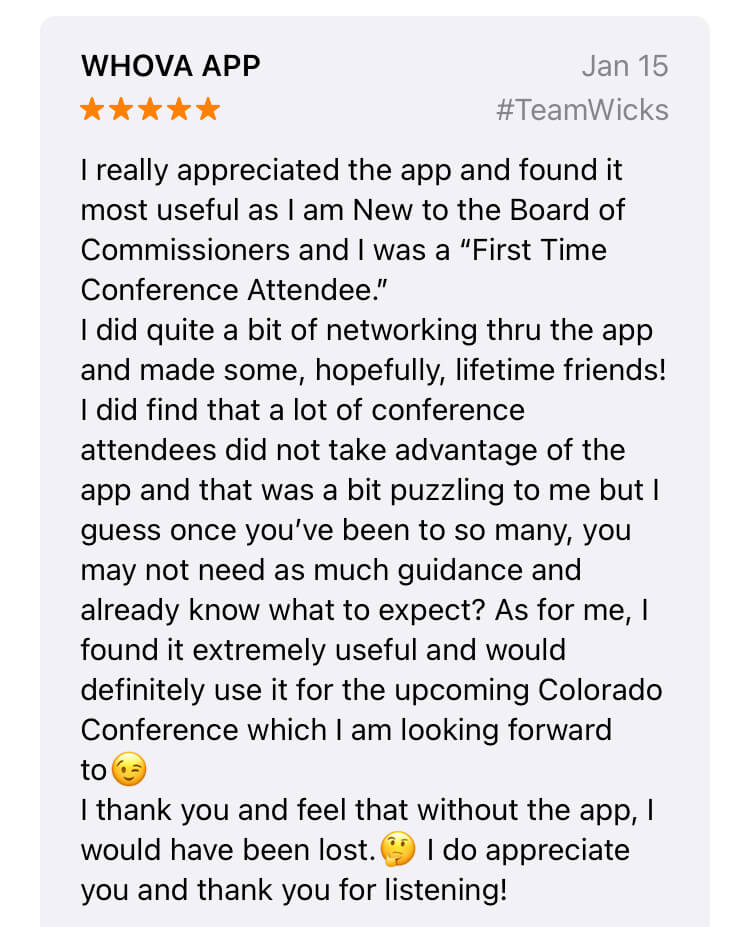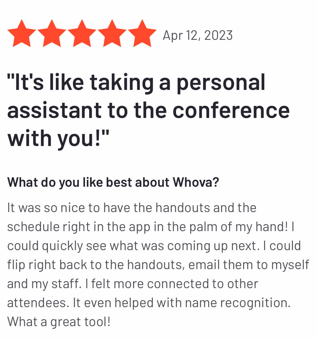 Seriously, everyone was talking about what a great app it was for the show. My partner and I were at the AESP conference and LOVED your app. We have even told our client about it and showed it to them to use at their conference coming up in March. The Whova app made the entire conference more productive and organized.