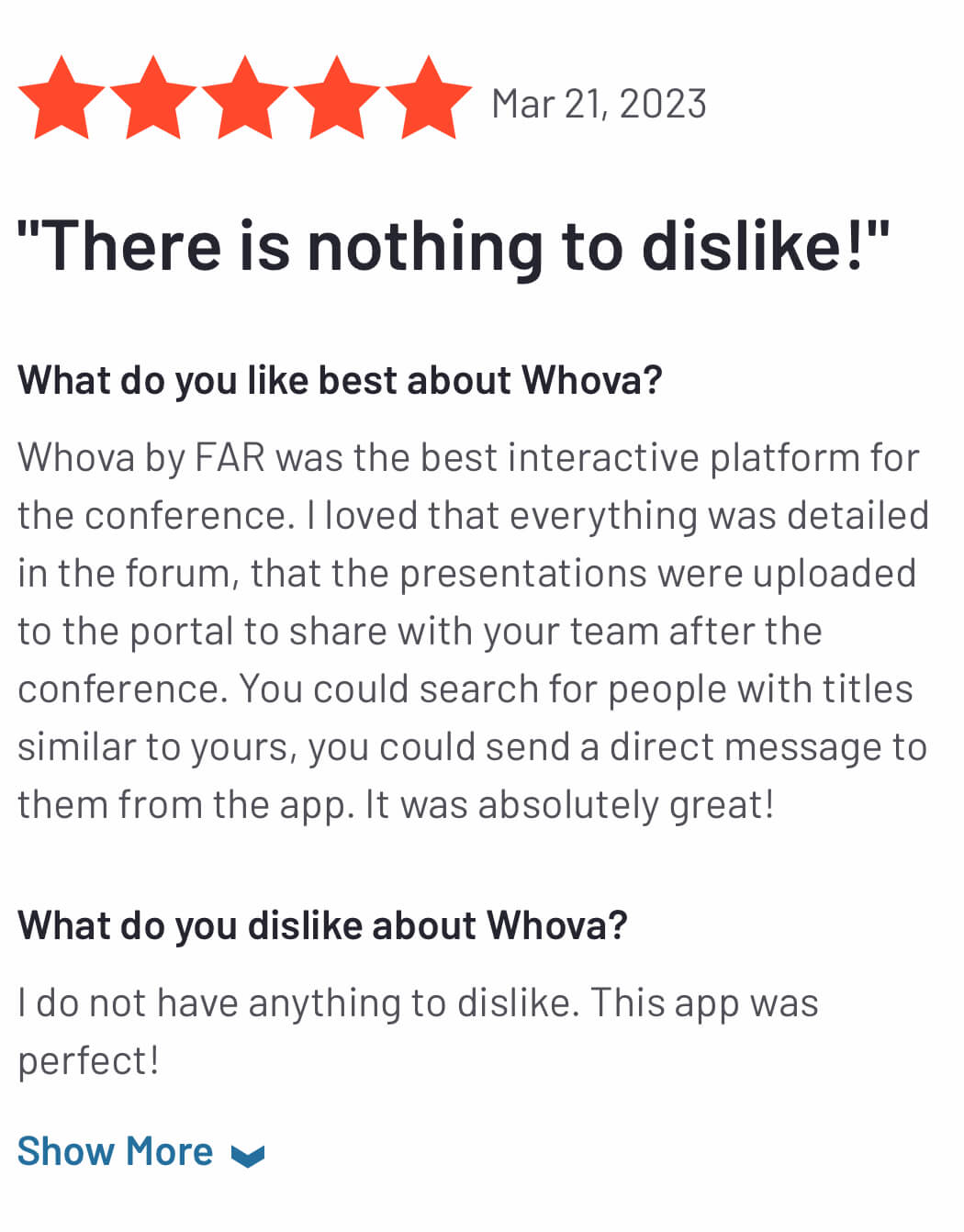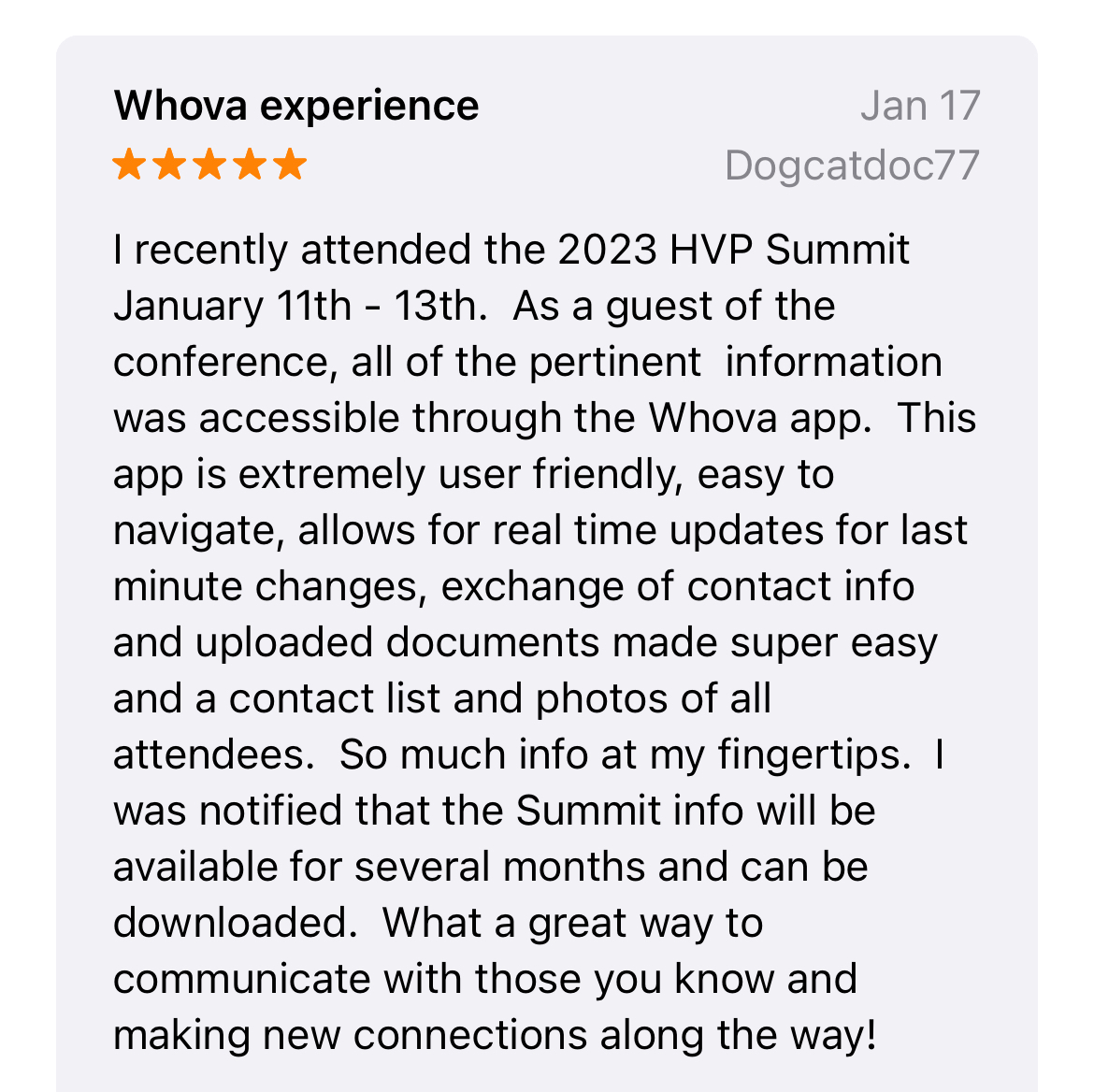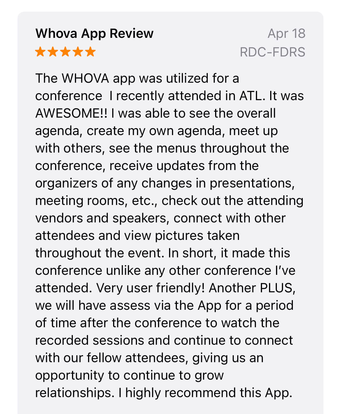 Seriously, everyone was talking about what a great app it was for the show. My partner and I were at the AESP conference and LOVED your app. We have even told our client about it and showed it to them to use at their conference coming up in March. The Whova app made the entire conference more productive and organized.
