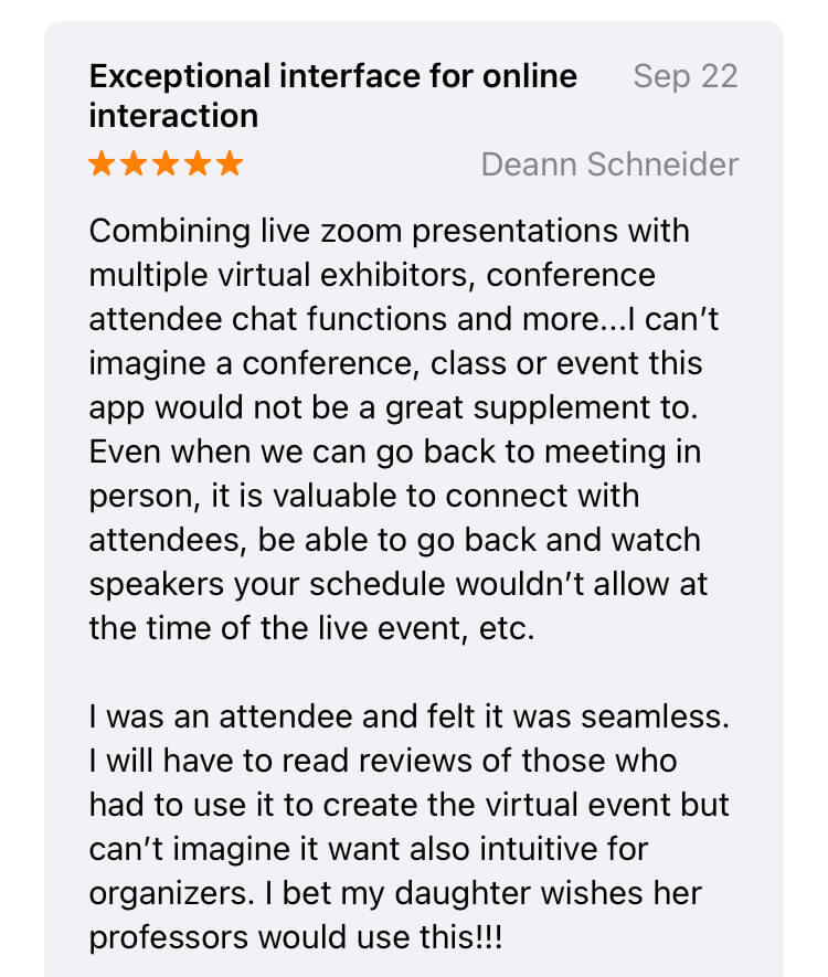 This APP is so amazing. It’s user-friendly and I was amazed on how when using the APP the breakout rooms were set up. Kudos to the creators! This tool is very helpful for big conferences to be held due to Covid.