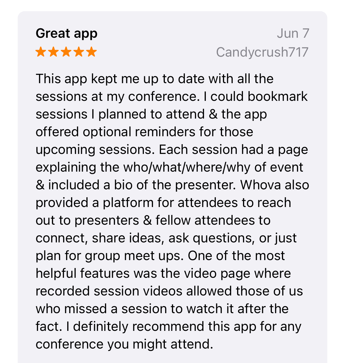 This app was extremely helpful to me at this meeting. It is the best meeting app I have seen yet. I liked that I could easily make my agenda, connect with people, scan business cards. It was VERY helpful to have people’s photos in the attendees section too. I was able to connect with many people with that simple add on. In fact, I am still using it to connect with people!