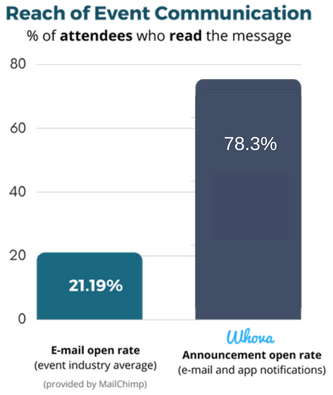 Several hundreds of events has used Whova’s new announcement system since we released it 2 months ago. We observed that the open ratio of an organizers’ message through Whova was 78% on average, significantly higher than the average email open rate in the event industry (21%, reported by MailChimp).