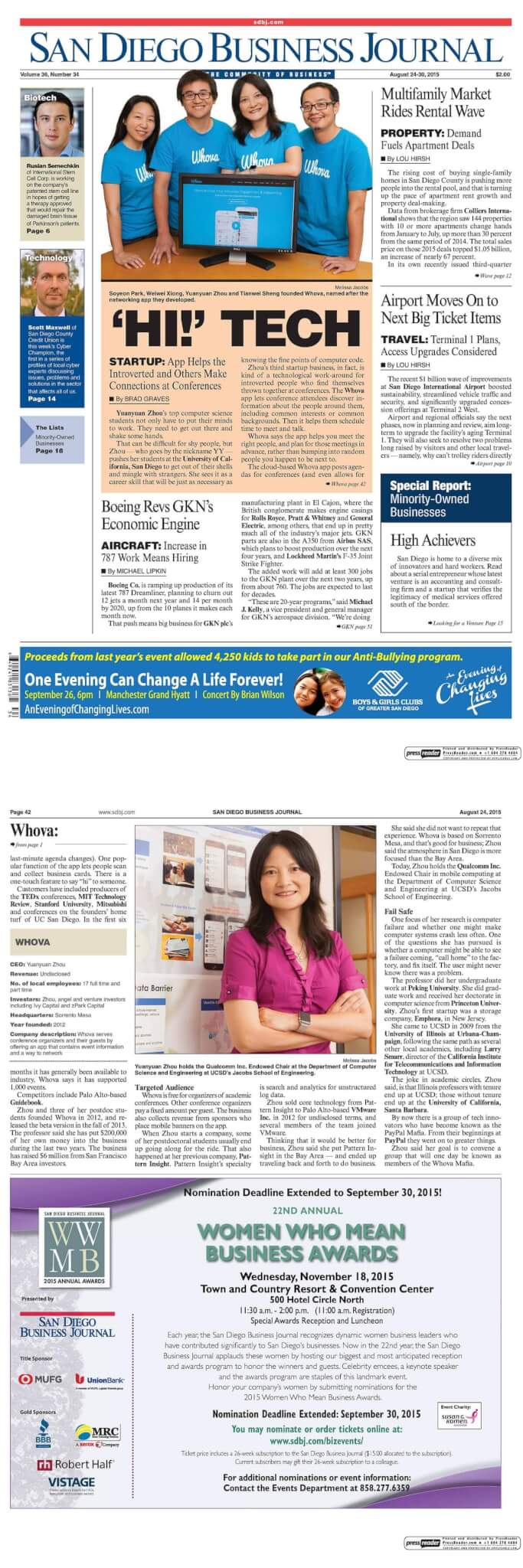 This morning, Whova is highlighted on the front page of San Diego Business Journal, an authoritative newspaper serving San Diego County for 35 years by delivering the market’s most complete package of business news and information.