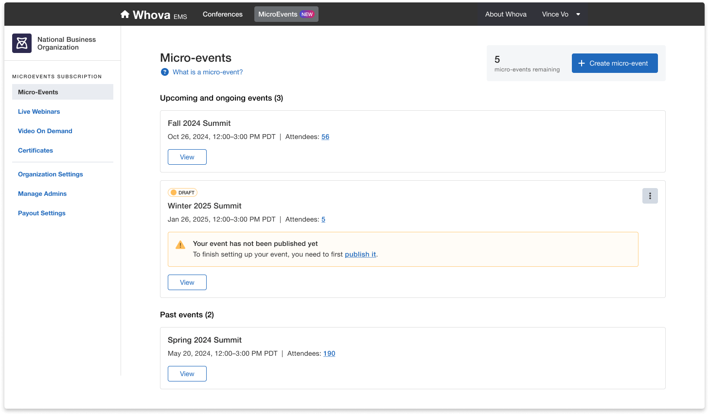 Customers who have used the Whova platform for large conferences (upcoming or within the past 12 months) can now enhance their event planning experience by adding the MicroEvents annual subscription—perfect for managing smaller in-person, virtual, or on-demand events. Please note that this subscription is an add-on to your large event standard package, and cannot be purchased separately.