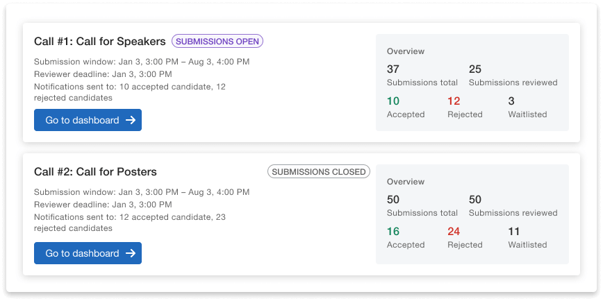 - Multiple calls: Collect different speaker information and submissions for different types of content with different submission format and review criteria. For example, a call for a poster (or demo), and a call for a long presentation.
