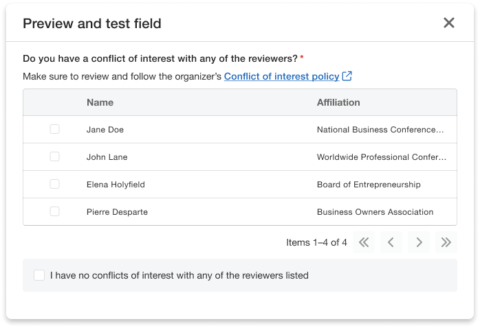 Ensure that when reviewers begin evaluations, they can quickly check for conflicts.
