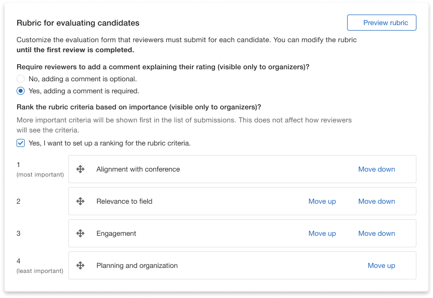 Lastly, the Enterprise Call for Speakers makes it easier for event organizers to ensure they are choosing the best speakers for their event. With score filtering and the prioritization of rubric criteria, organizers can weigh different aspects of a submission according to their importance, ensuring that their top criteria align with the event’s goals.