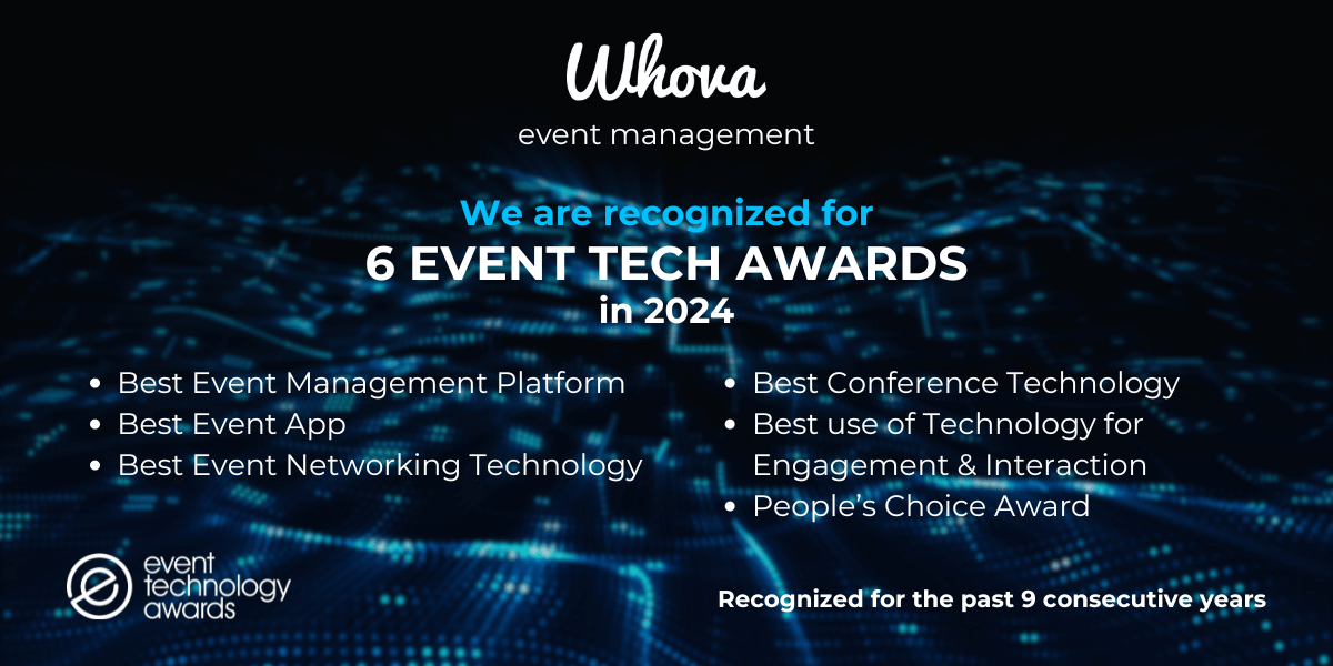 Whether your next event is an association gathering, a corporate event, or an expo, you can rely on Whova to provide the support and tools you need to plan a successful event. We are honored to be recognized by the Event Technology Awards for our continuous effort to help organizers create ever-better events.