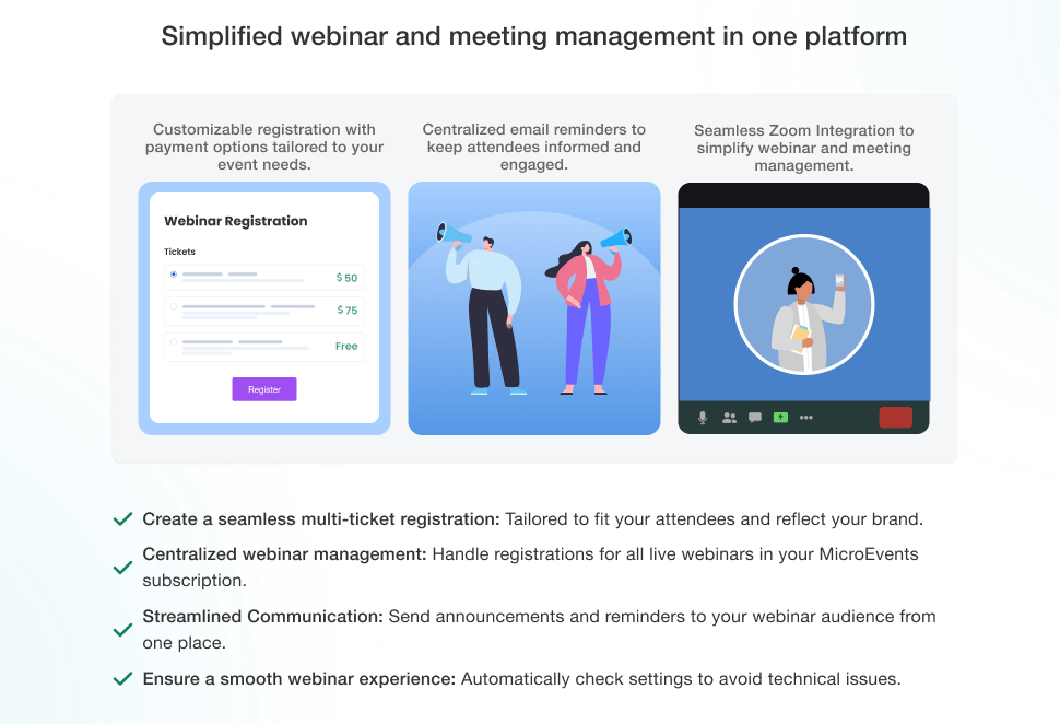 By leveraging our existing integration and partnership with Zoom, we deliver a fully integrated experience that saves organizers time and reduces stress.