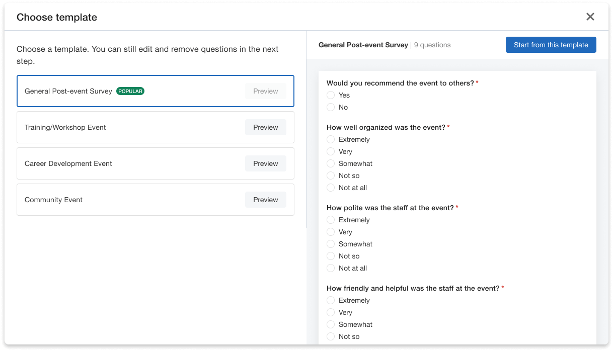 Choose from one of Whova’s comprehensive survey templates or make your own!