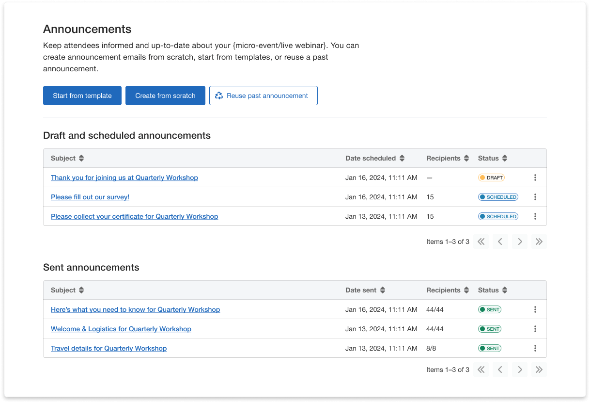 Send pre-event reminders to speakers with important details, and follow up post-event with thank-you emails and feedback forms. Communicating with attendees is just as simple and effective, with email announcement templates for event updates, reminders, or live notifications to keep everyone informed. You can even customize your own announcement or reuse past ones to eliminate redundancy.