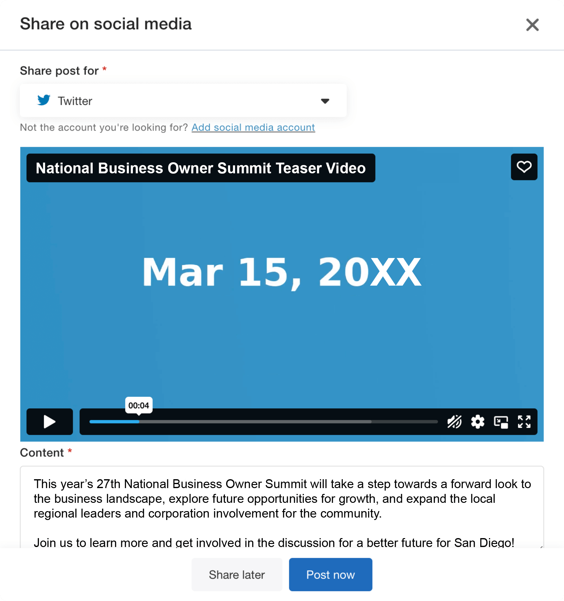 Once your app is published within Whova, your App Teaser Video will be generated and ready to share. There will also be text to accompany your video as a social media post, but you will be able to make edits before posting. From there, you can download or directly share your video to start increasing event awareness and engagement among your attendees.