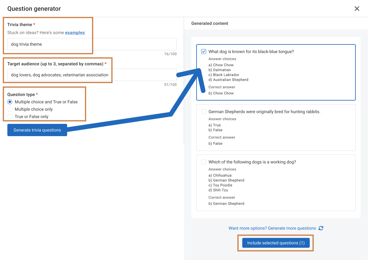 Tell our question generator what you want and then select your perfect questions – without having to think them up yourself!