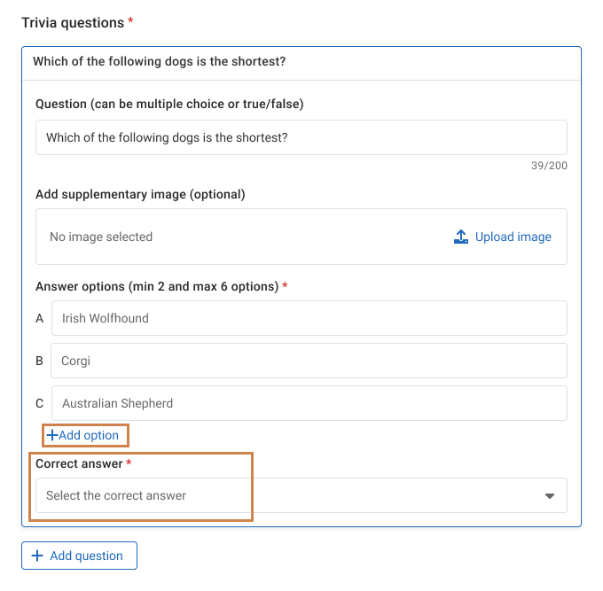 And for more control – write your own questions and designated answers from scratch. You even have the ability to give the question a fun twist by adding your own images!
