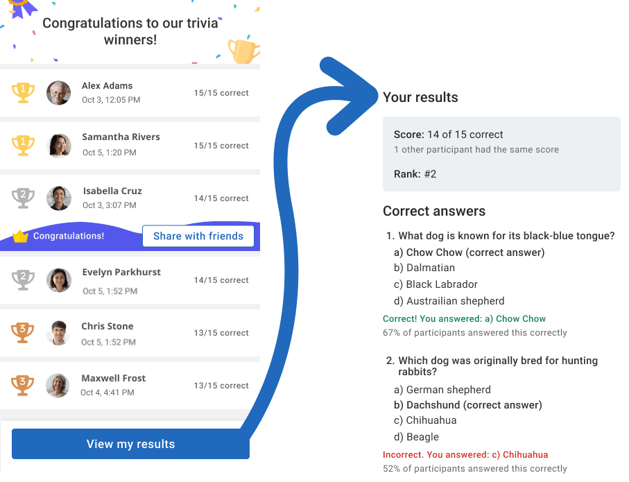 With intuitive rules and simple question styles, attendees can participate in your trivia game effortlessly. They take the questions one at a time in an easy-to-read layout, and we’ll show them fun animations after each answer.