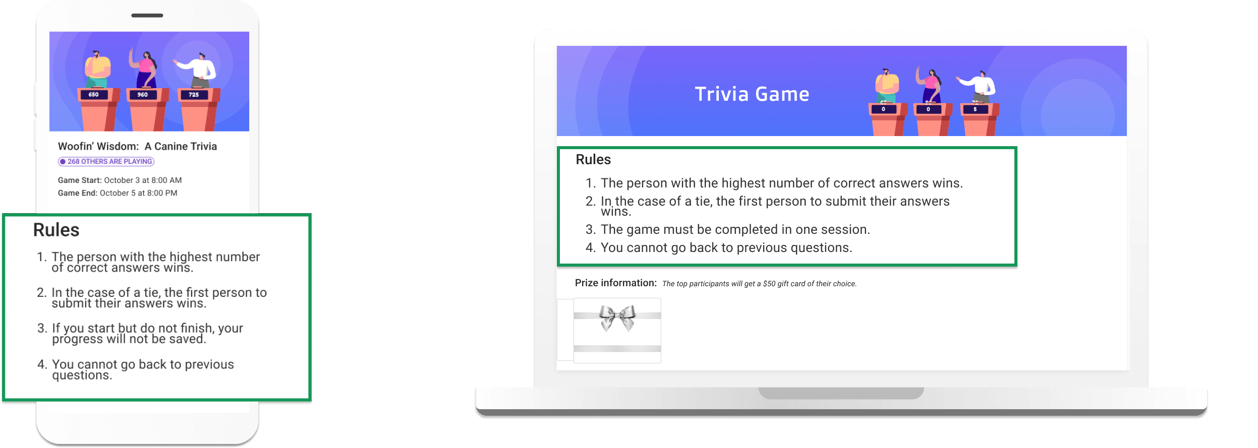 Whether attendees play from the mobile app or from the web app, they’ll instantly have a clear picture of the rules and the prize for your trivia game.