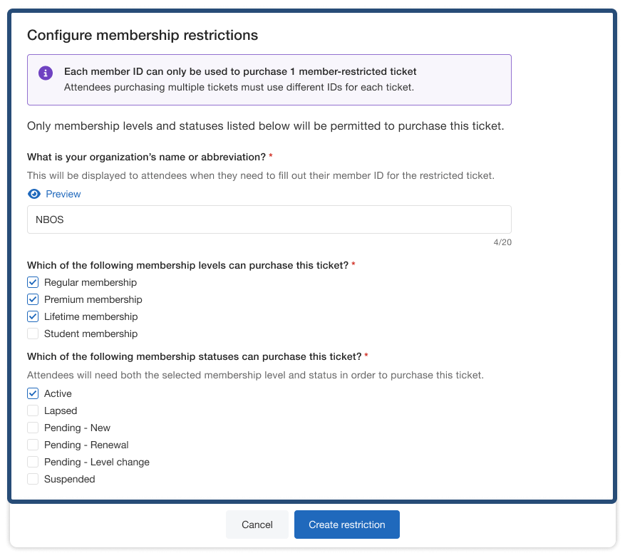 Specify the eligible membership levels and statuses for a member-only ticket