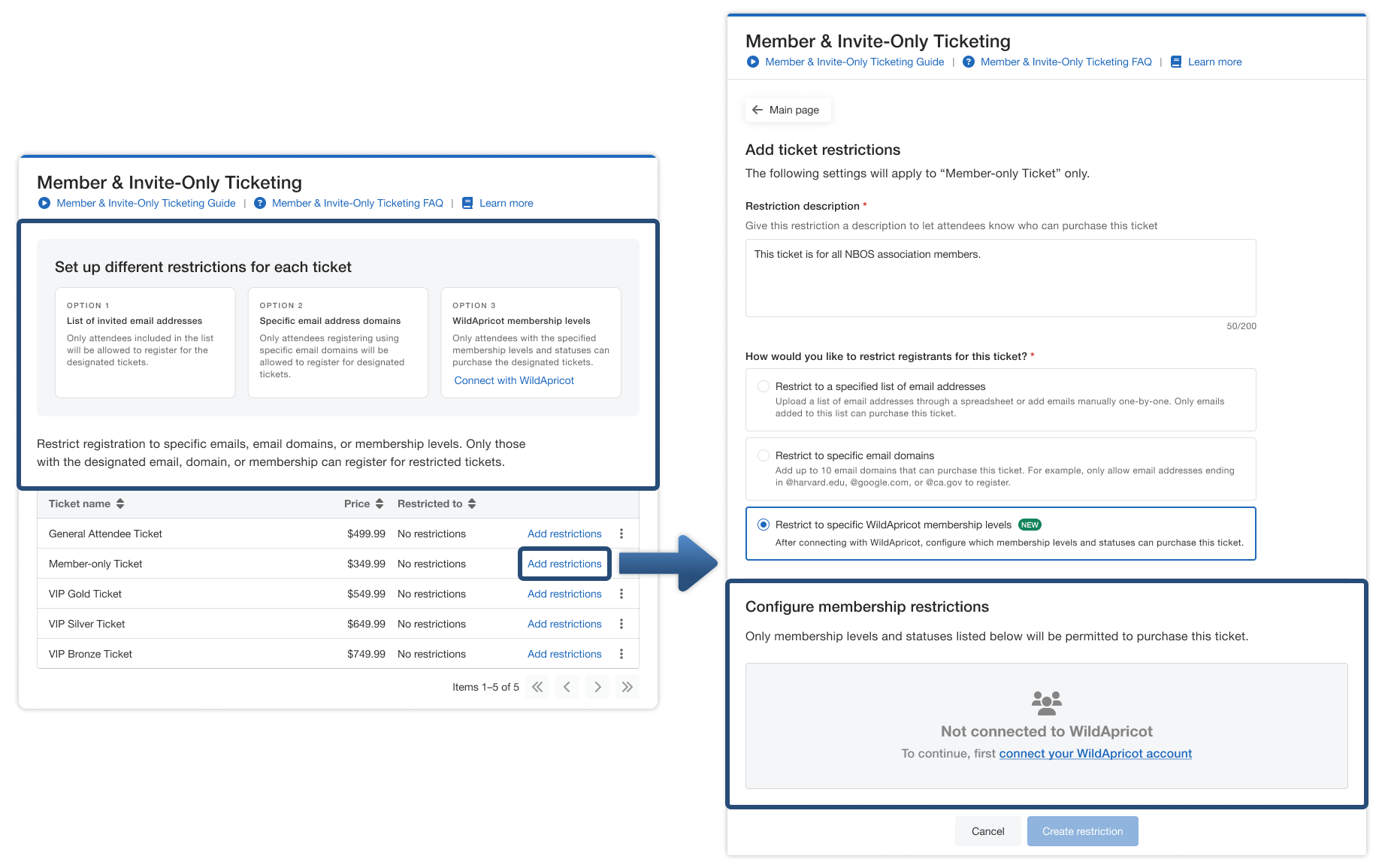 Step 1: After creating your tickets on the Whova dashboard, go to the “Member & Invite-Only Ticketing” menu (originally named “Invite-Only Ticketing”). Then, click the “Add restrictions” option of the desired ticket type that you plan to offer to your members managed on WildApricot. Please note that this step is the same as the previous “Invite-Only Ticketing” if you’ve used it before.