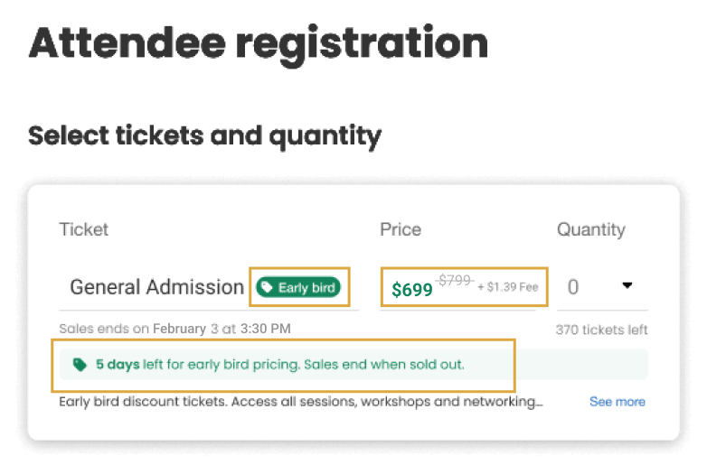 It’s easy for attendees to see the ticket’s discounted price and when early bird sales will end – incentivizing purchases!