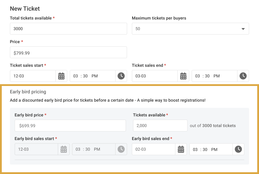 Doing so will allow you to fill out basic details; simply enter the early bird ticket price and the ending times/dates when attendees can still purchase this ticket. You can also add the number of available tickets, ensuring that you only sell early bird tickets to as many attendees as you’d like.