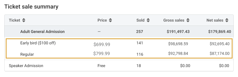Track your early bird ticket purchases in your sales summary! They will be associated with your regular ticket prices, so you can see how well they performed.