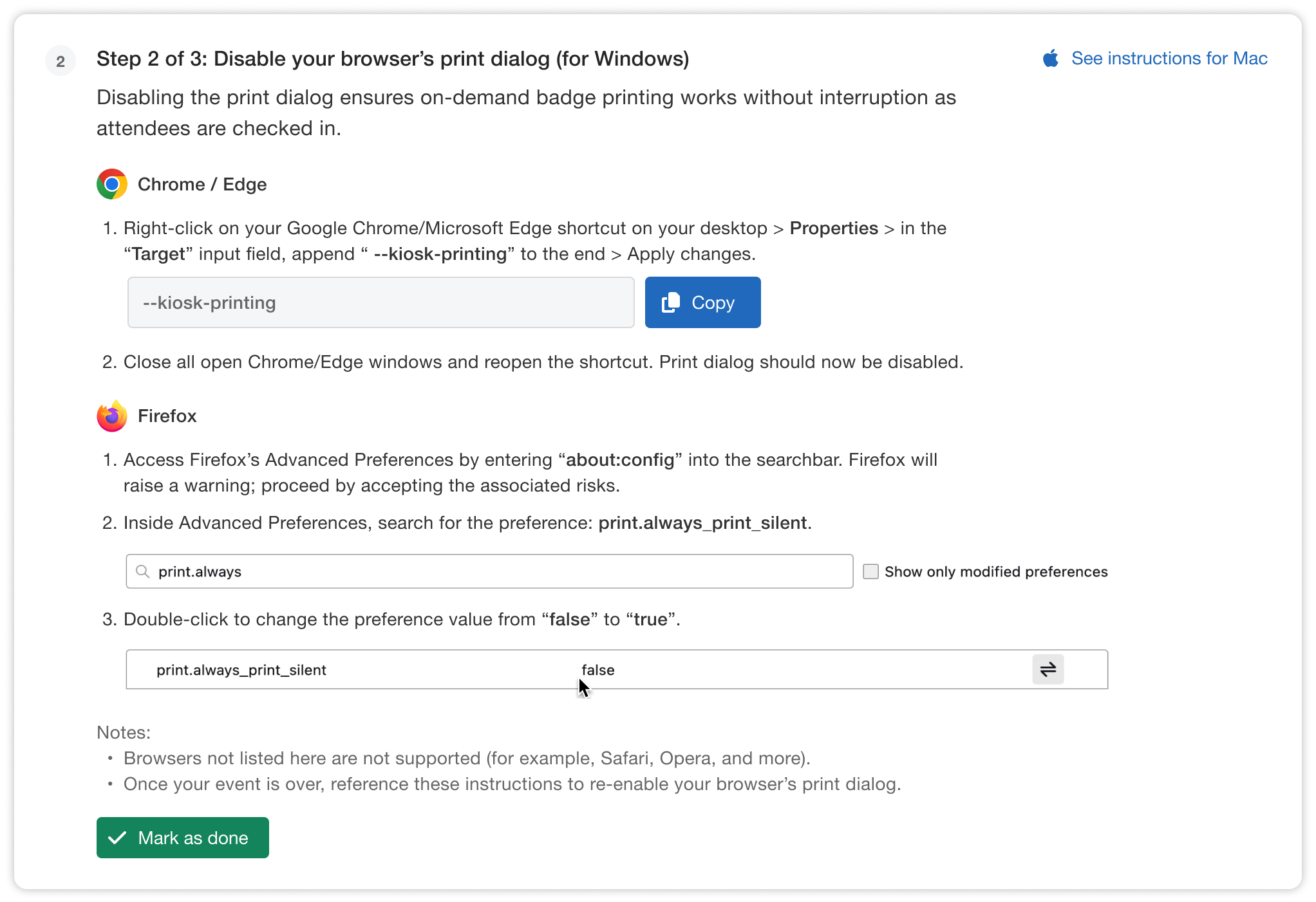 Then, follow the instructions to disable your browser’s print dialog. This step ensures that when a badge is being printed, everything runs smoothly and the process isn’t interrupted by disturbing confirmation pop-ups.
