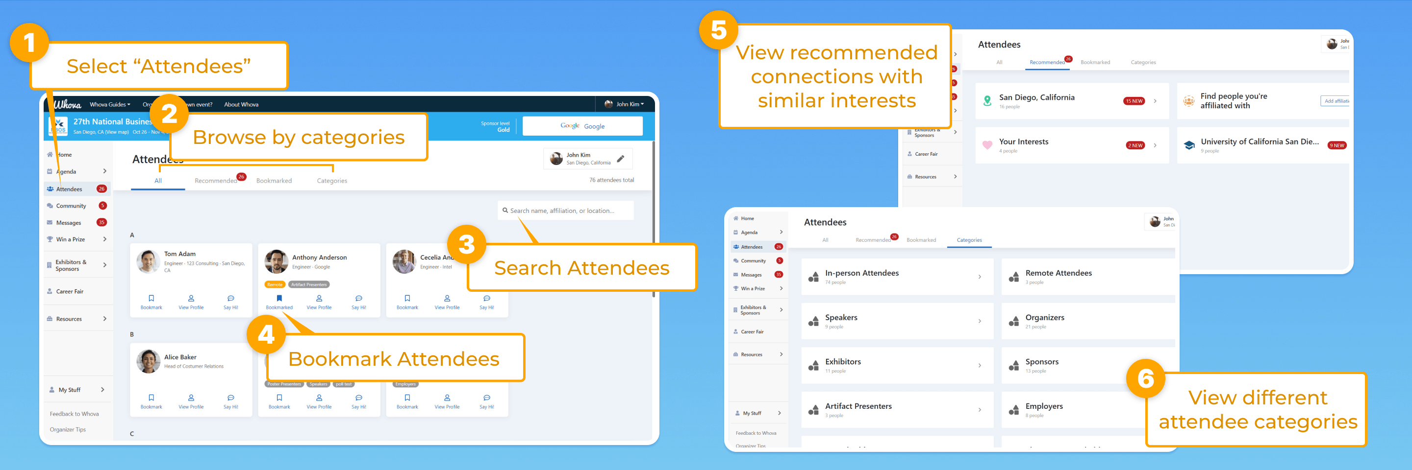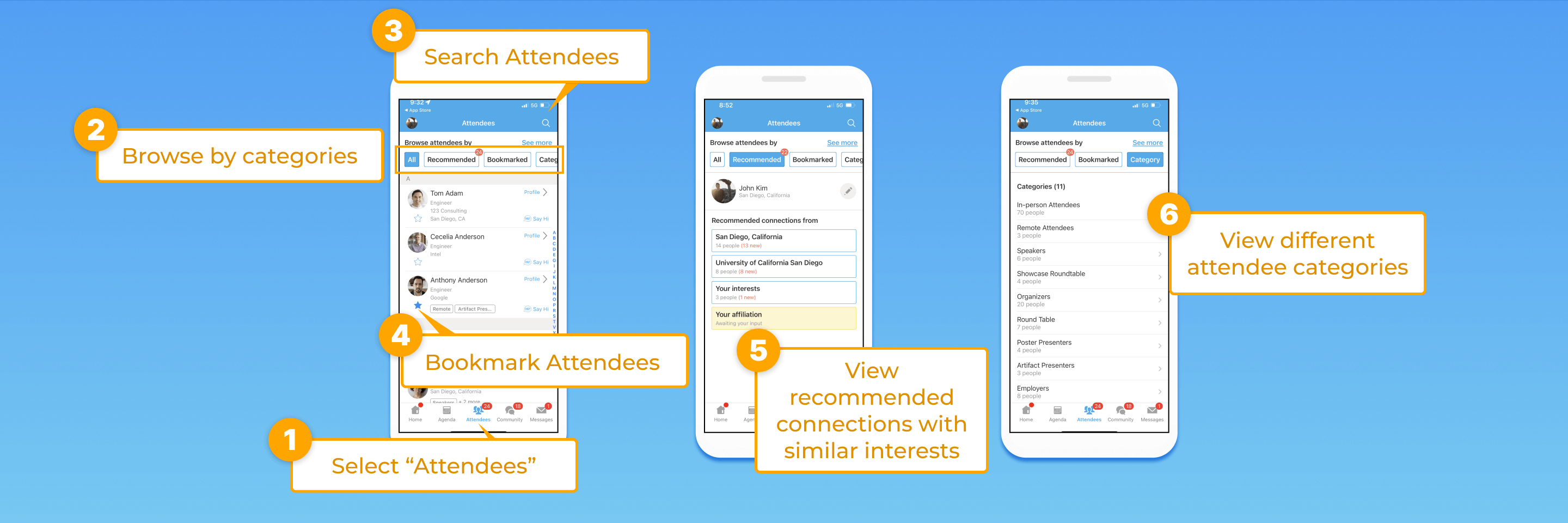 - Browse attendees by all, recommended, bookmarked, and attendee categories.