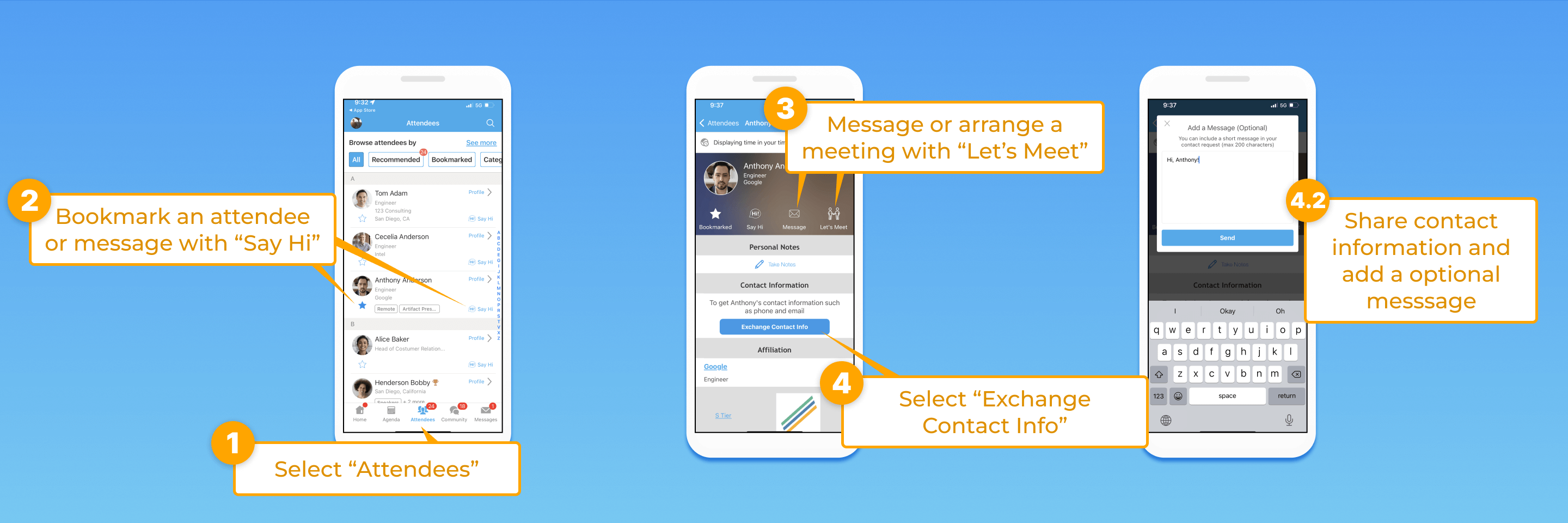 - By bookmarking attendees, you can easily find them later in one tab.