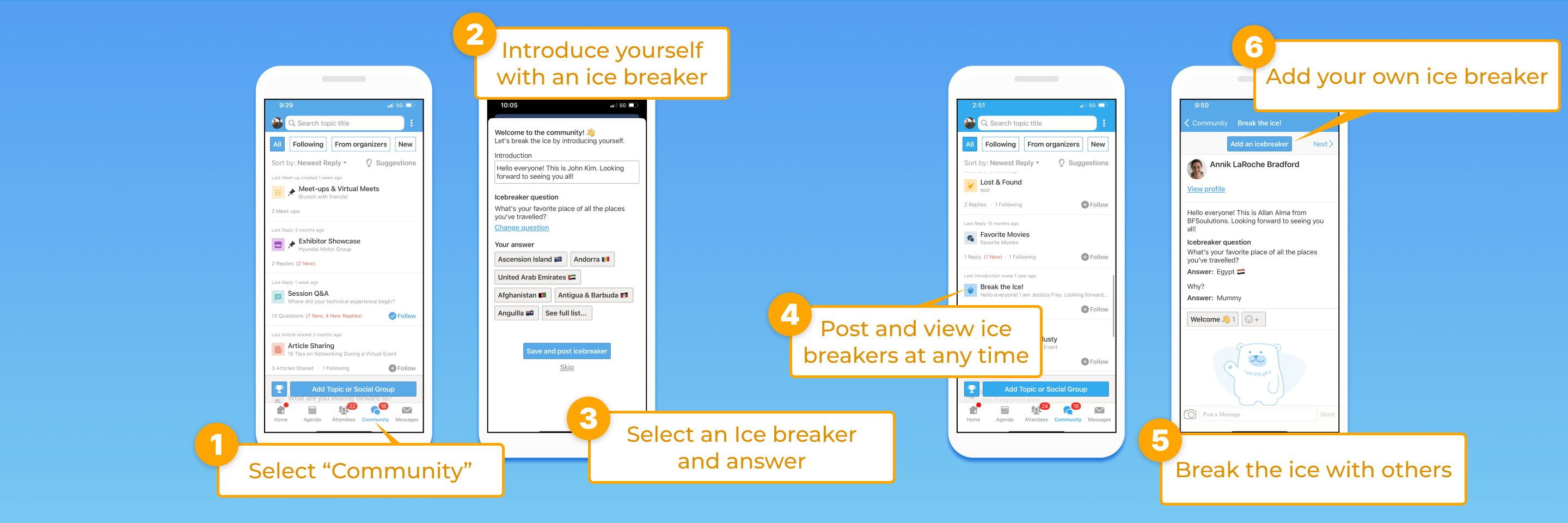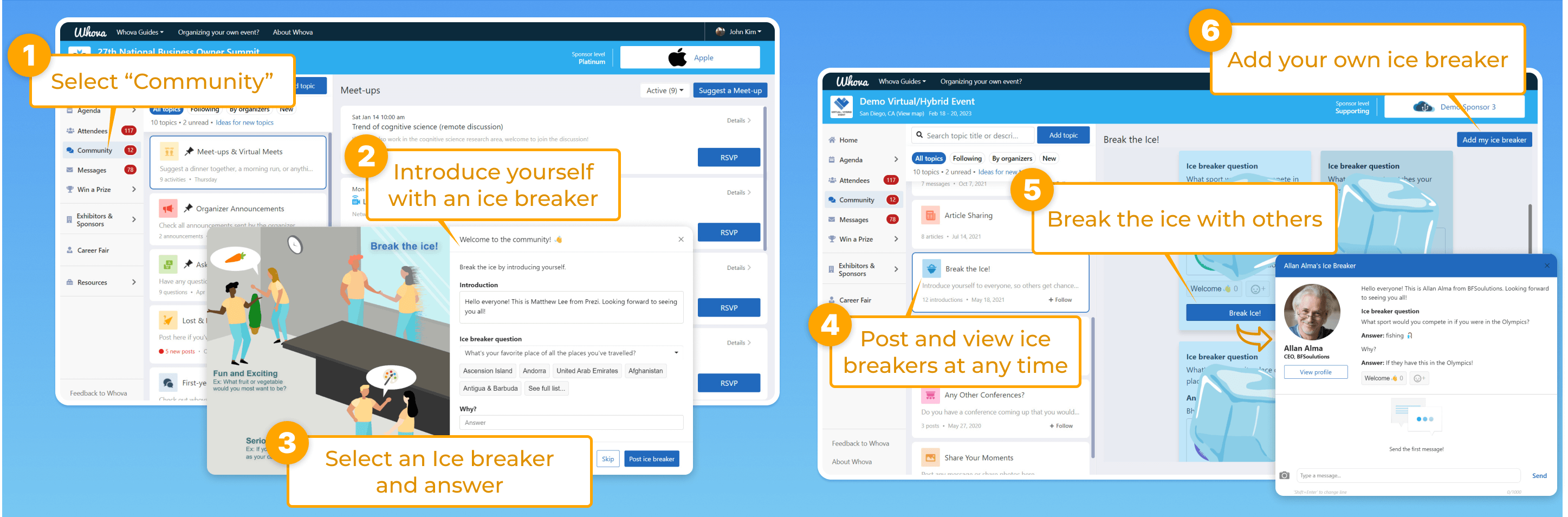 - Click “add my ice breaker” to post your own at any point of the event.
