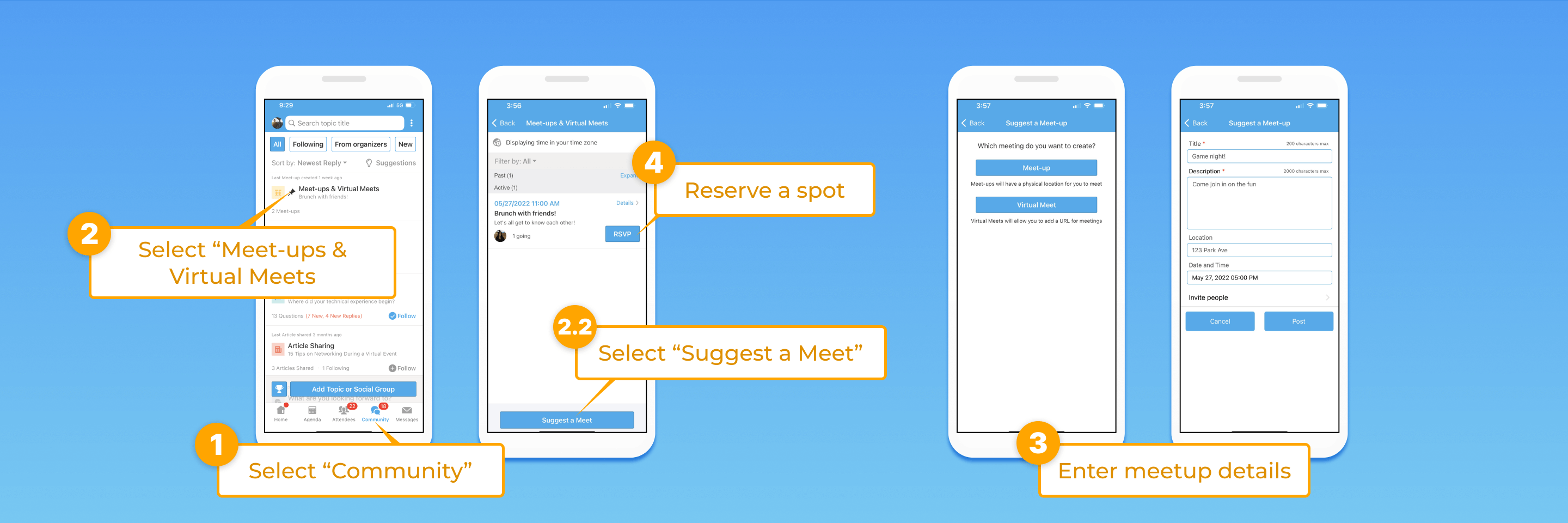 - Click on the meet-up topic and then select “suggest a meet-up” button at the bottom, and choose between a physical meeting or a virtual meeting.