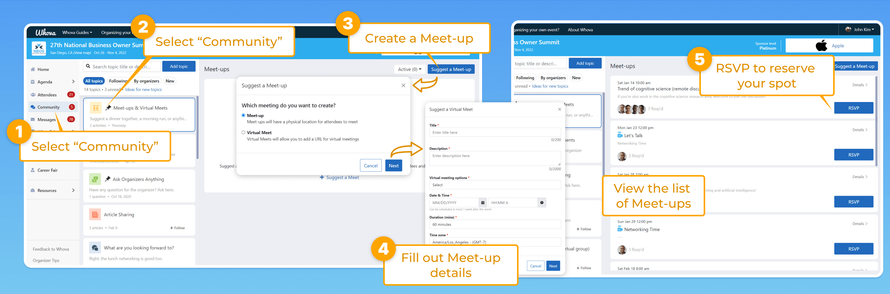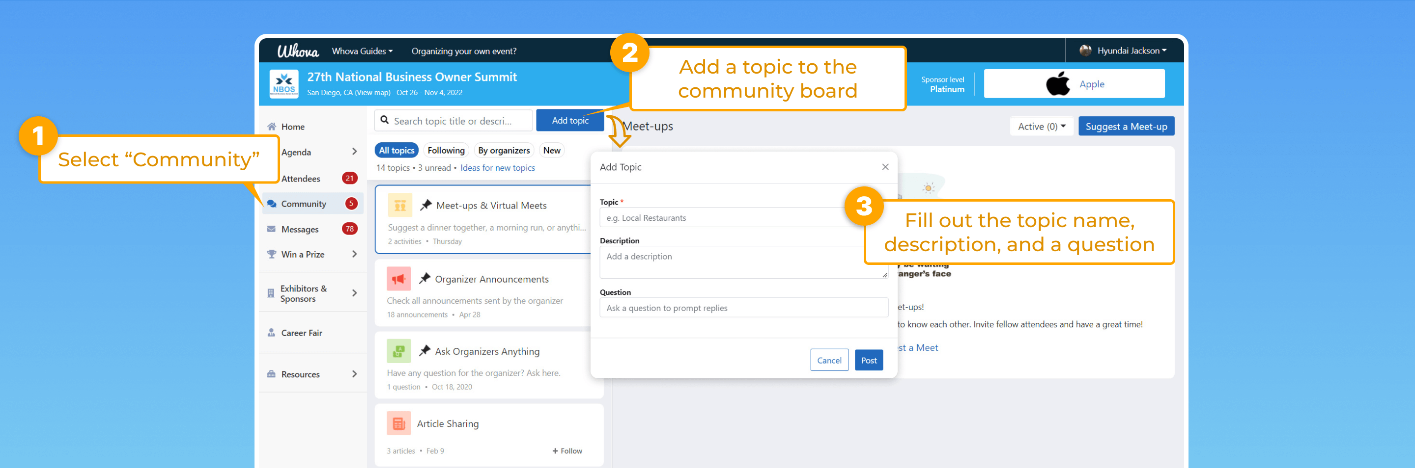 Whova’s Community Board is a valuable tool you can utilize to network and set up hangouts with fellow attendees, introduce yourself through virtual ice breakers, and participate or create social groups.