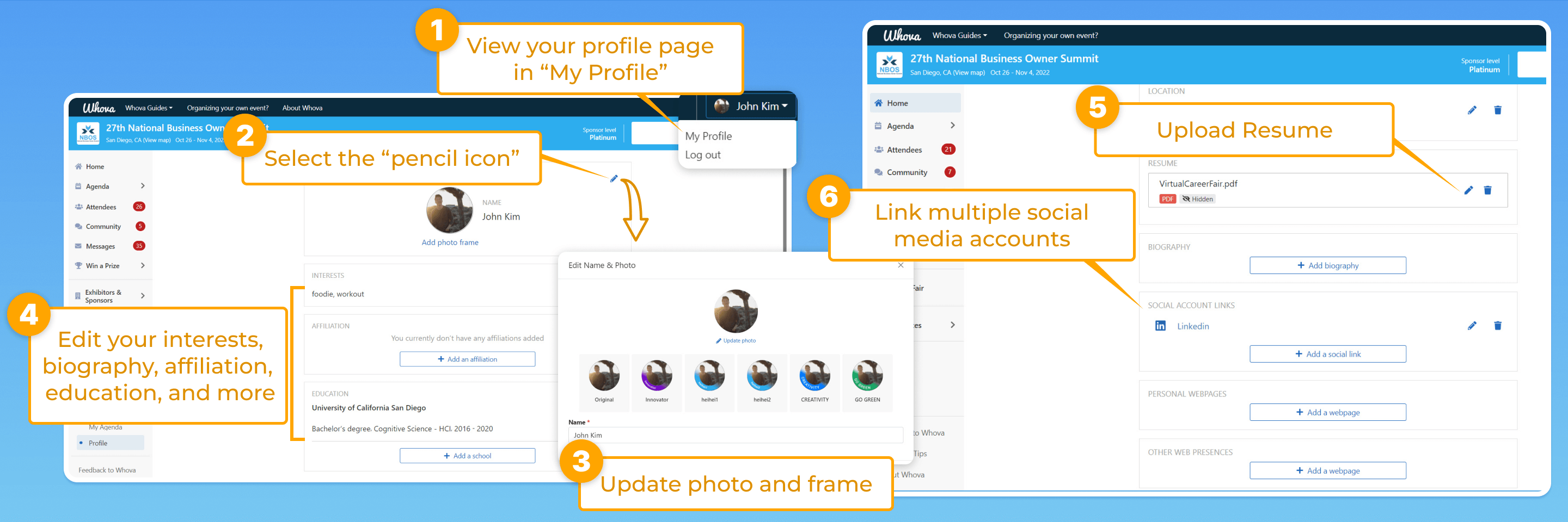 - Edit your profile before, during, or after the event by clicking your profile image in the upper right corner of the event dashboard.