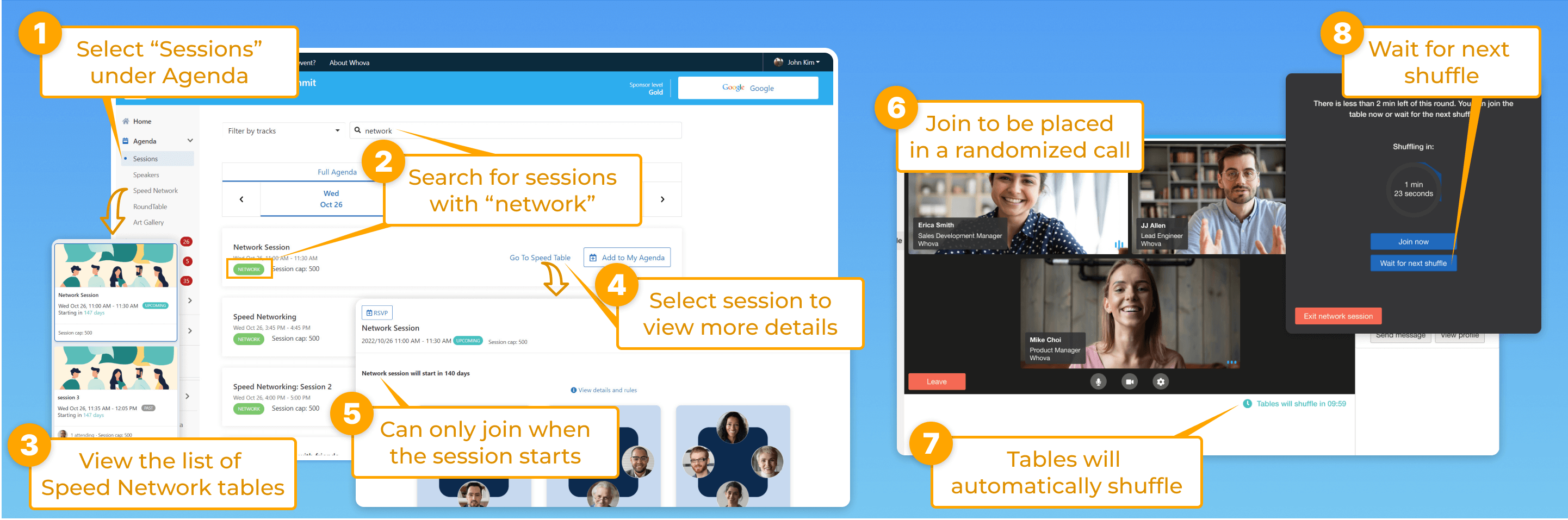 - After a set amount of time, you will automatically be shuffled into a new virtual table with all new attendees.