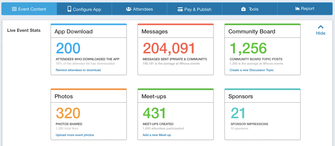 However, sometimes you would like to get live event statistics quickly and easily, including how many people have downloaded the app, how often your sponsor banner has been viewed, how actively your attendees are participating in the event, etc. It will help you make a quick decision and take action proactively in order to improve your event at the right moment.