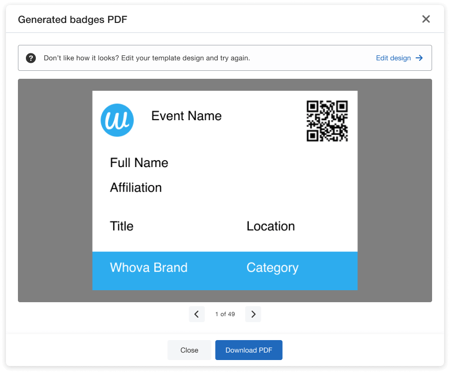 In addition to our new printer support, we have also made it even easier to generate our name badges, simplifying the process and saving you time and energy. Start by selecting your printer model (whether office printer or one of the label printers), designate a badge size (we suggest using our recommended size settings for best compatibility), choose one of Whova’s professionally designed templates, then generate the badge PDF and print!