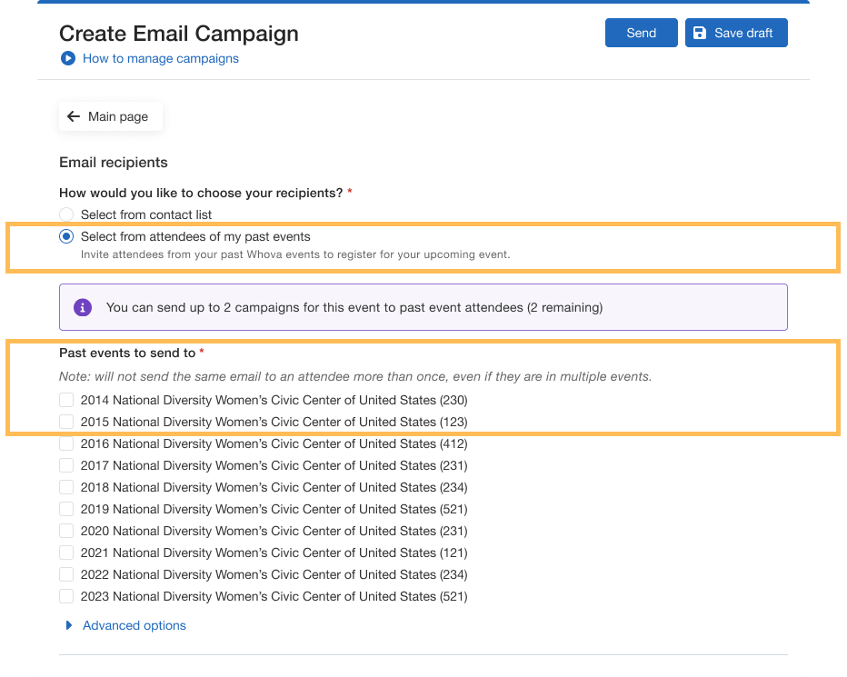 Send up to two campaigns to past event attendees