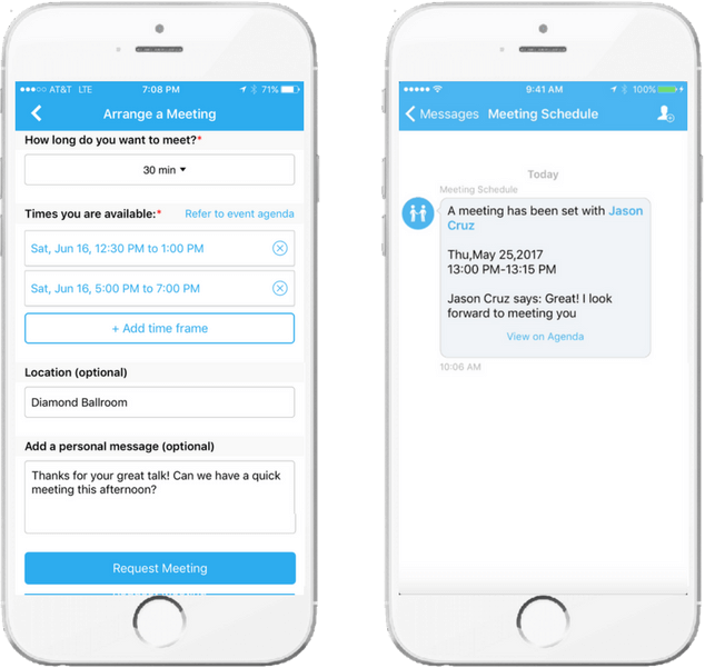 < Meeting Scheduling form and the accept notification within the Whova event app >