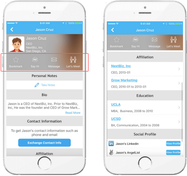< Attendee profile and networking features on the Whova event app >