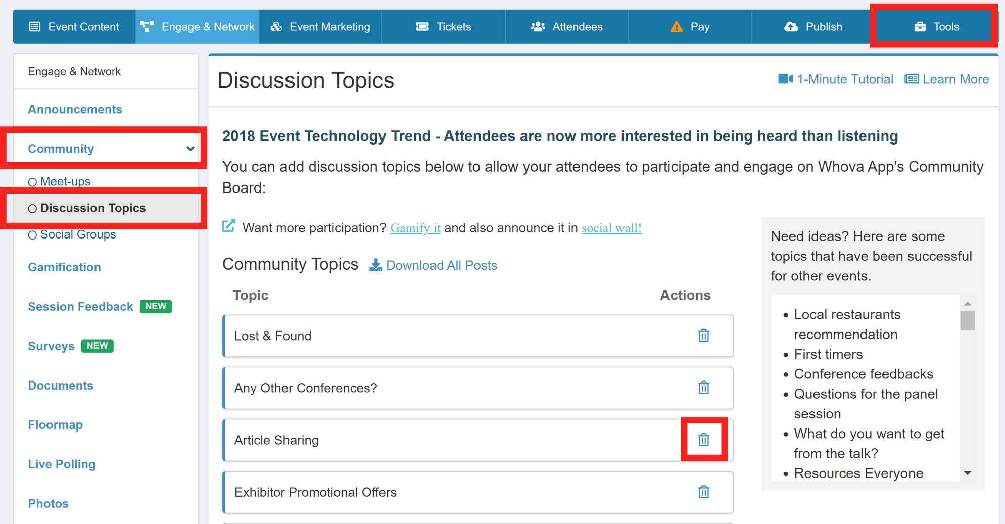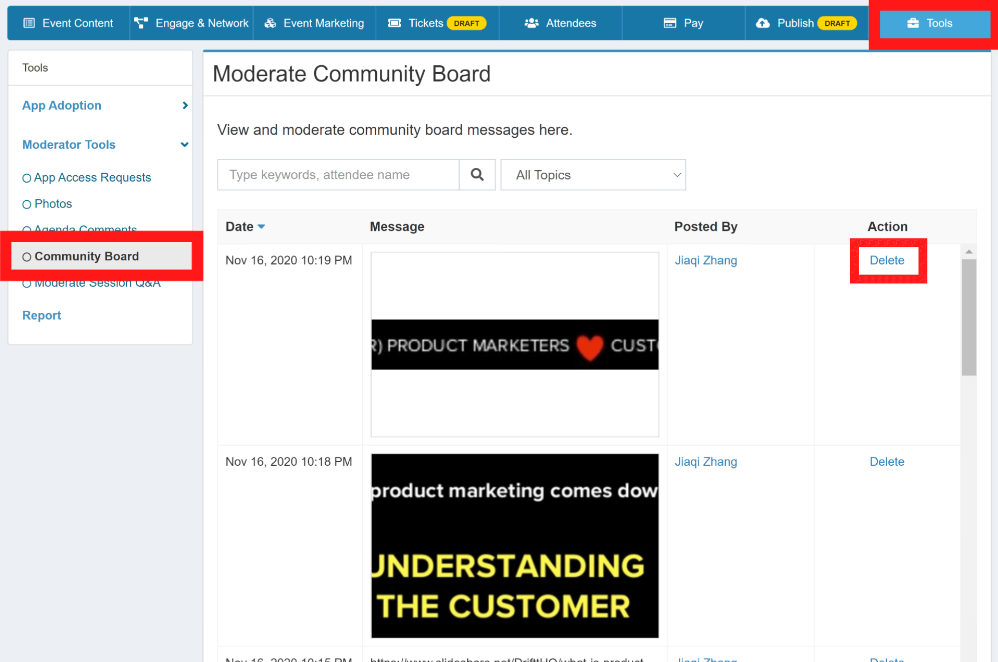 Delete discussion topics on the Community Board